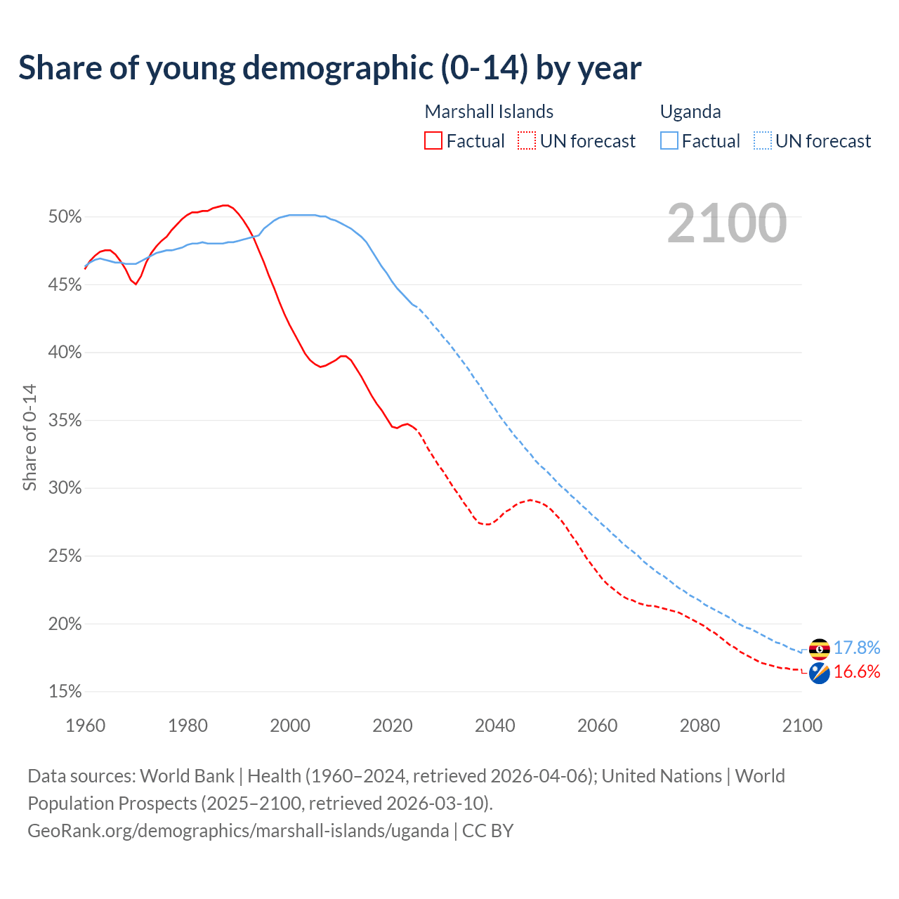 - The share of young demographic (0-15 years old) in the Marshall Islands is 34.5% vs 43.5% in Uganda.
