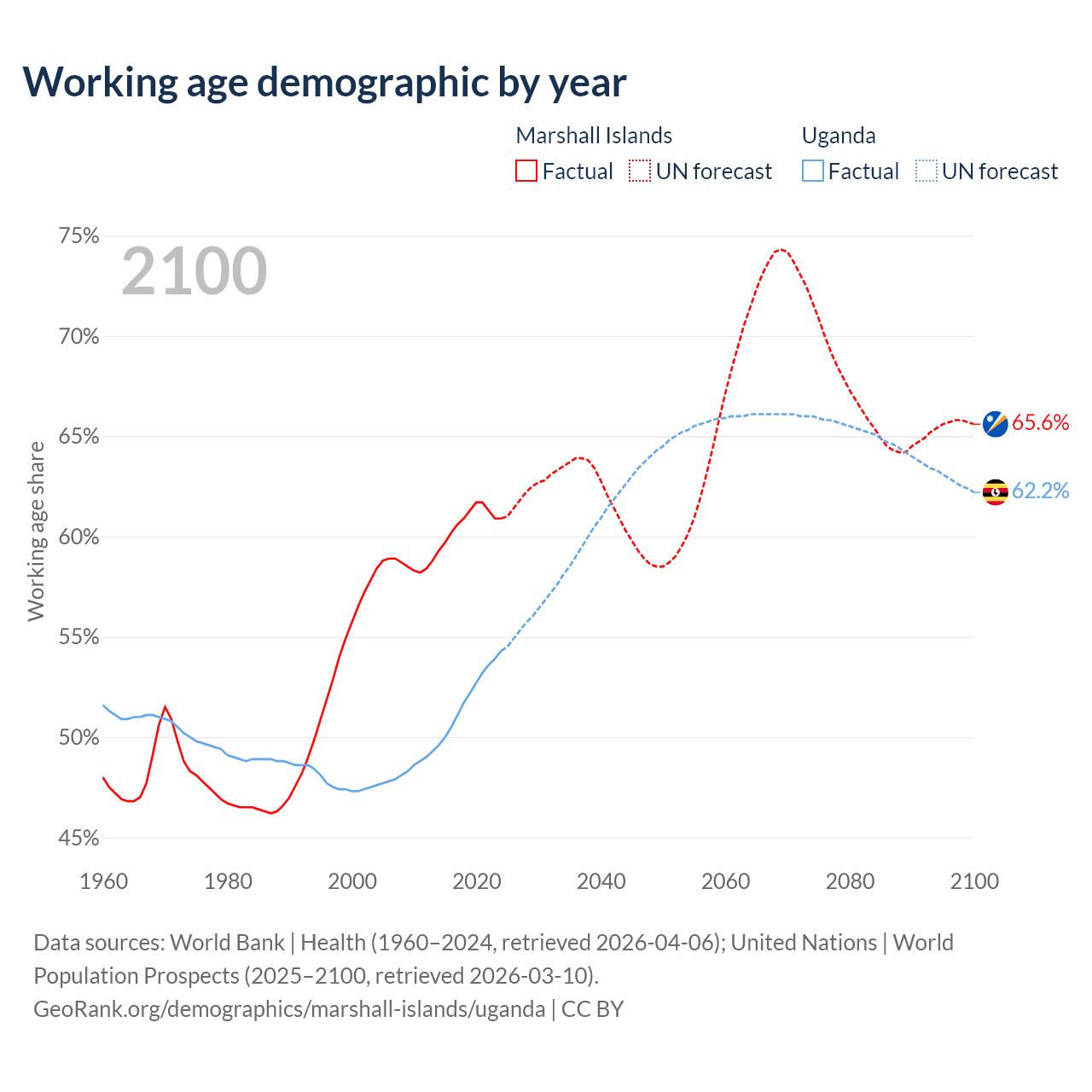 - The Marshall Islands has 21.3K working age adults (aged 15-64) vs 28.9M in Uganda.