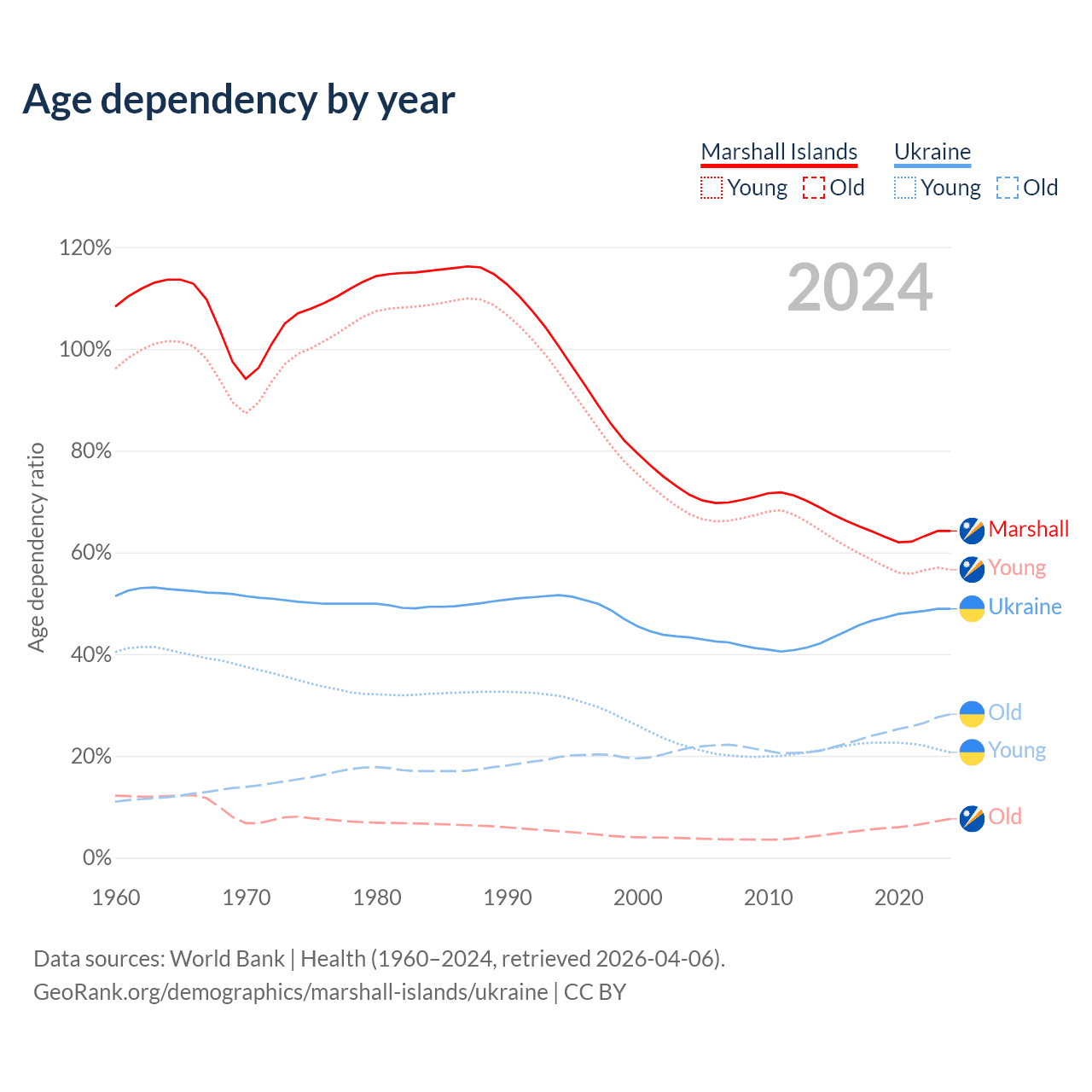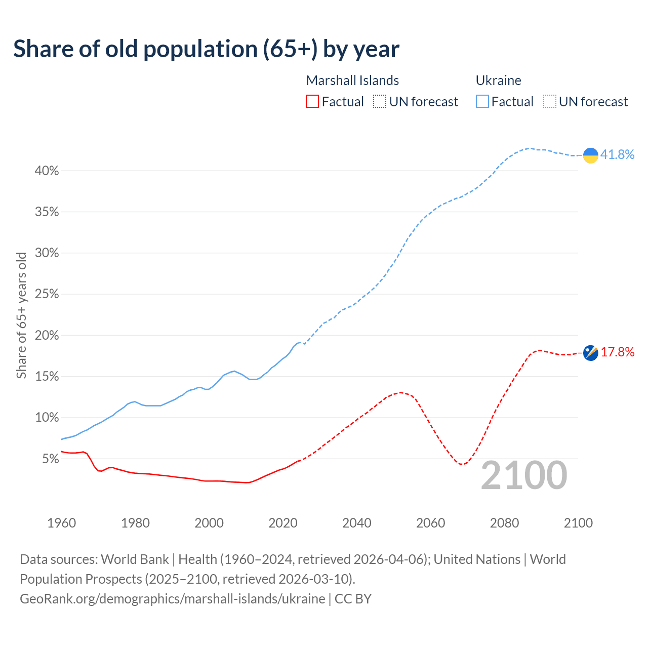 - The share of old-age demographic (65+) in the Marshall Islands is 4.64% vs 19% in Ukraine.