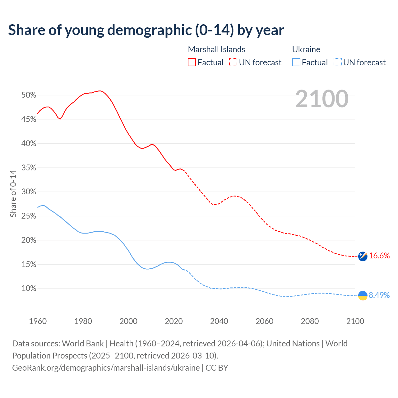 - The share of young demographic (0-15 years old) in the Marshall Islands is 34.5% vs 13.9% in Ukraine.