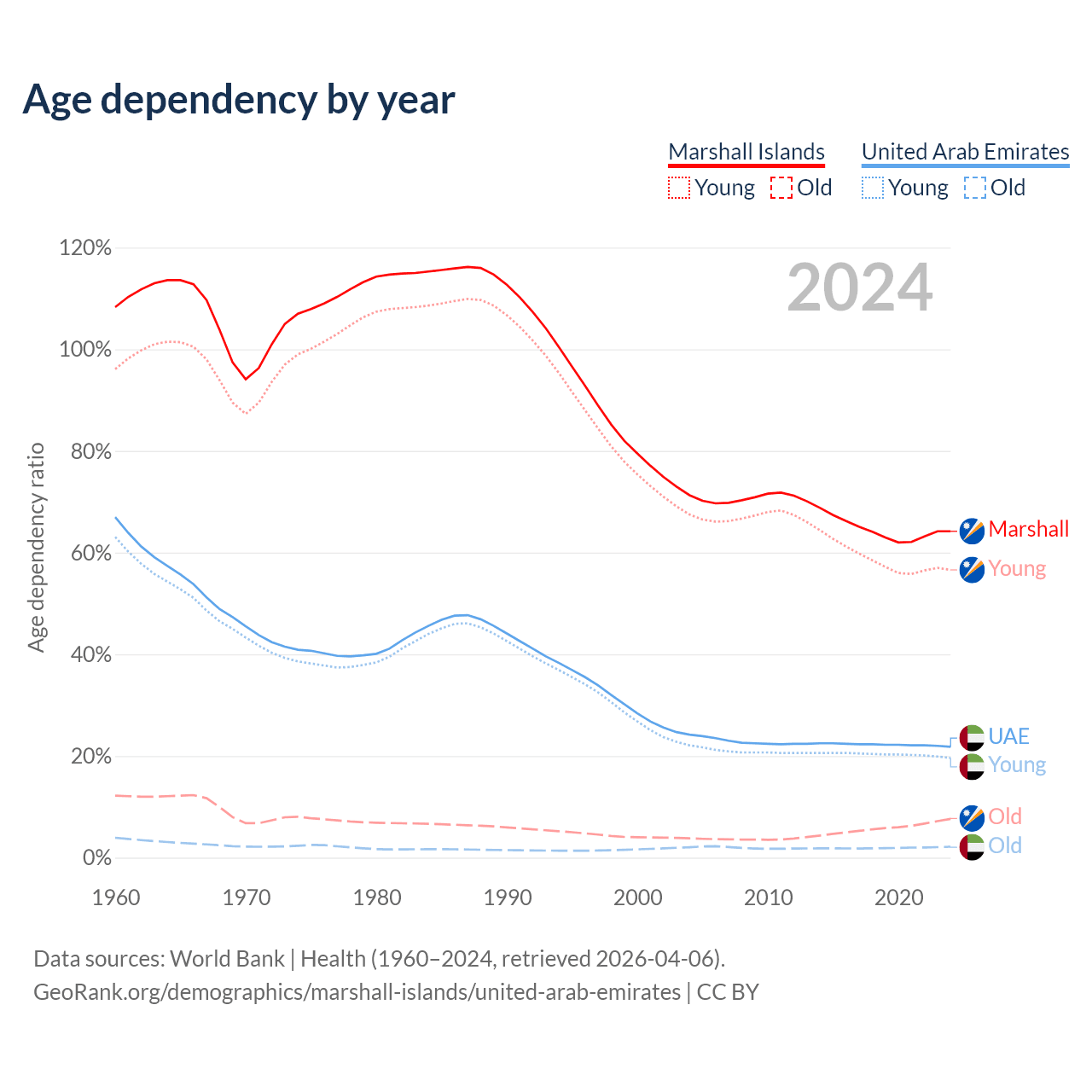 Data sources: World Bank | Health (1960–2024, retrieved 2026-04-06); U.S. Census Bureau (1960–2024, retrieved 2026-02-08).