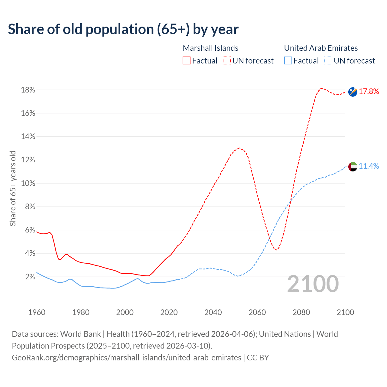- The share of old-age demographic (65+) in the Marshall Islands is 4.64% vs 1.77% in the United Arab Emirates.