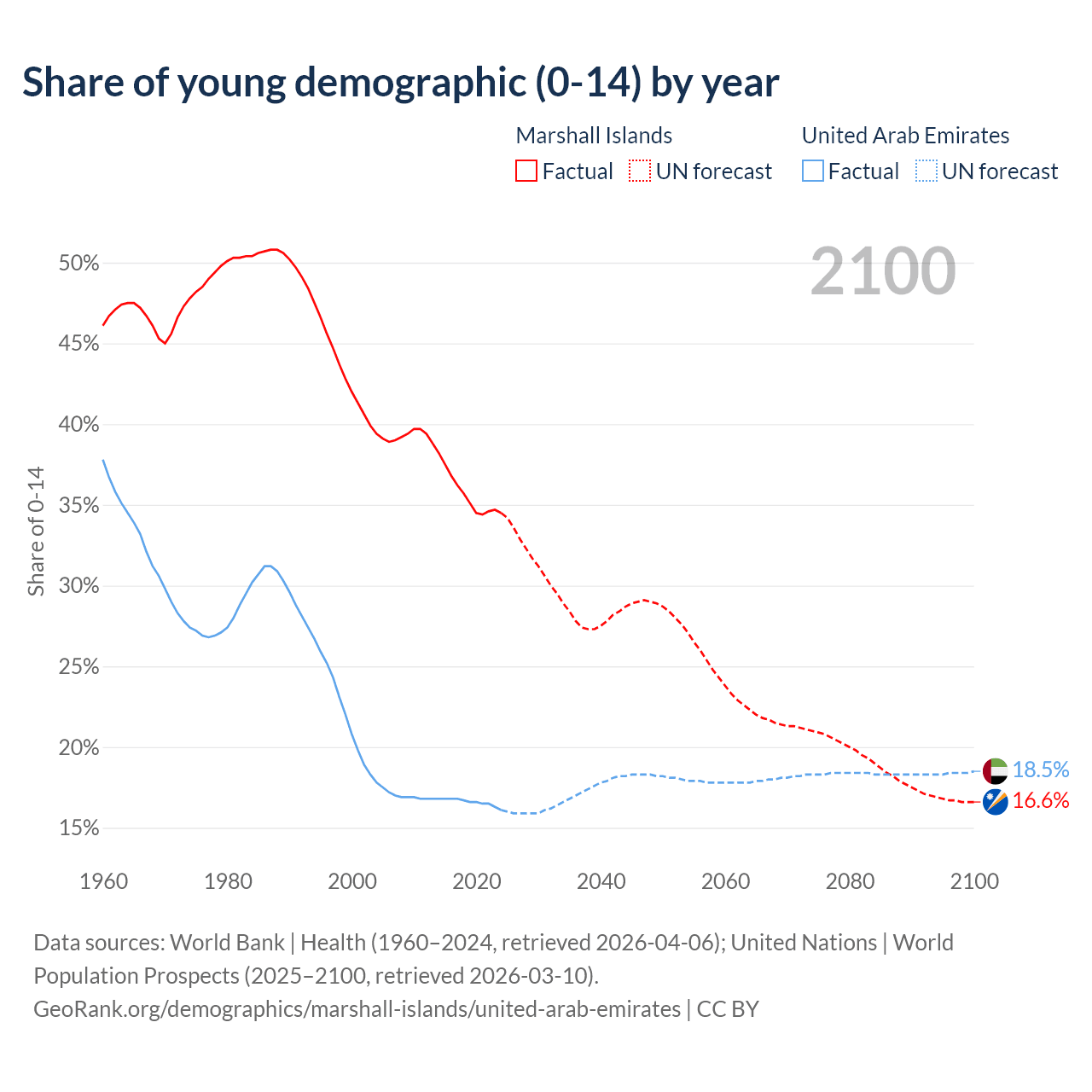 - The share of young demographic (0-15 years old) in the Marshall Islands is 34.5% vs 16.1% in the United Arab Emirates.