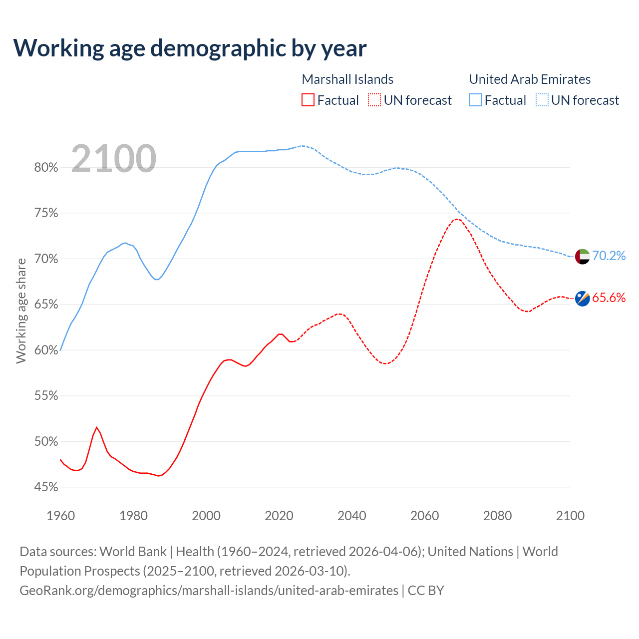 - The Marshall Islands has 21.3K working age adults (aged 15-64) vs 9.6M in the United Arab Emirates.