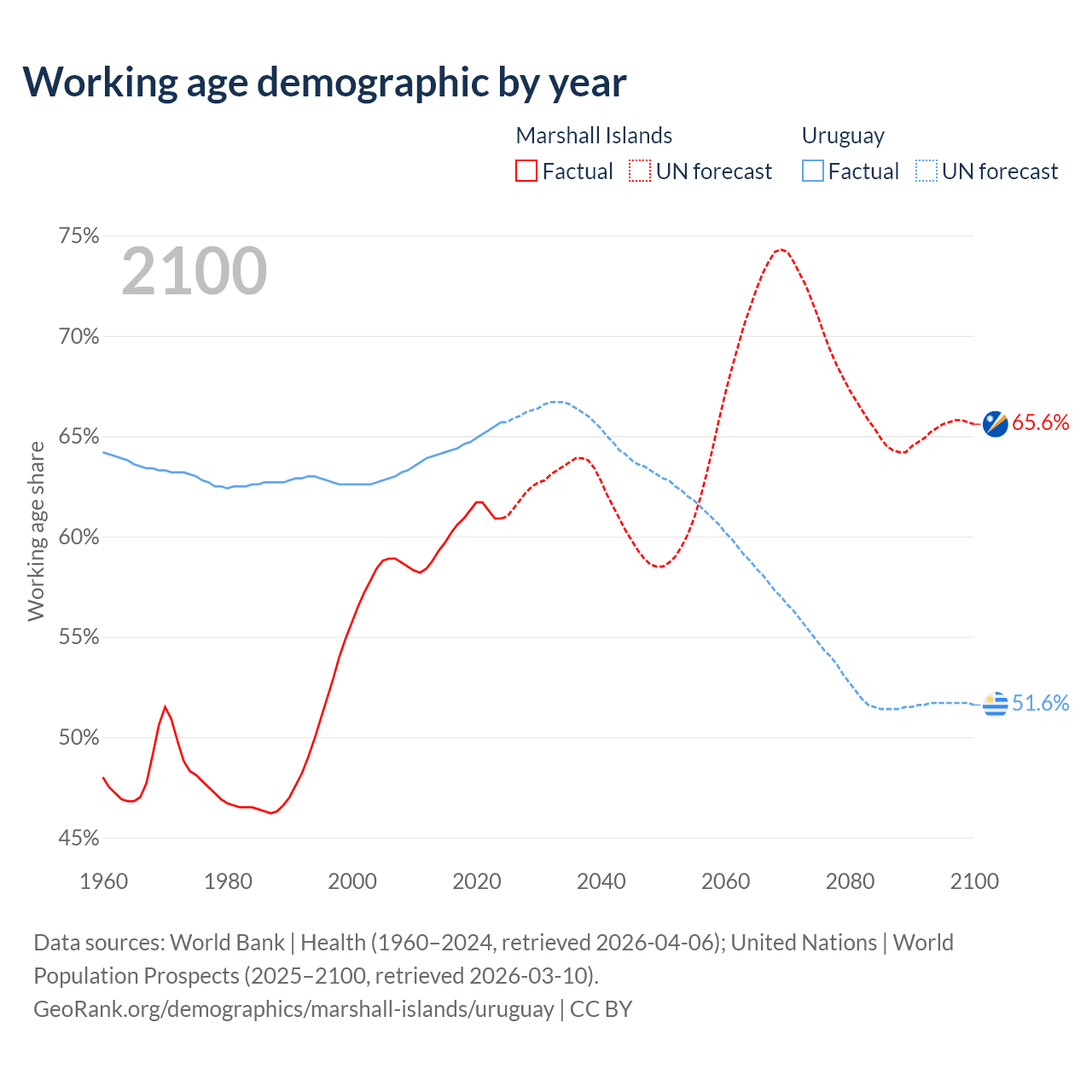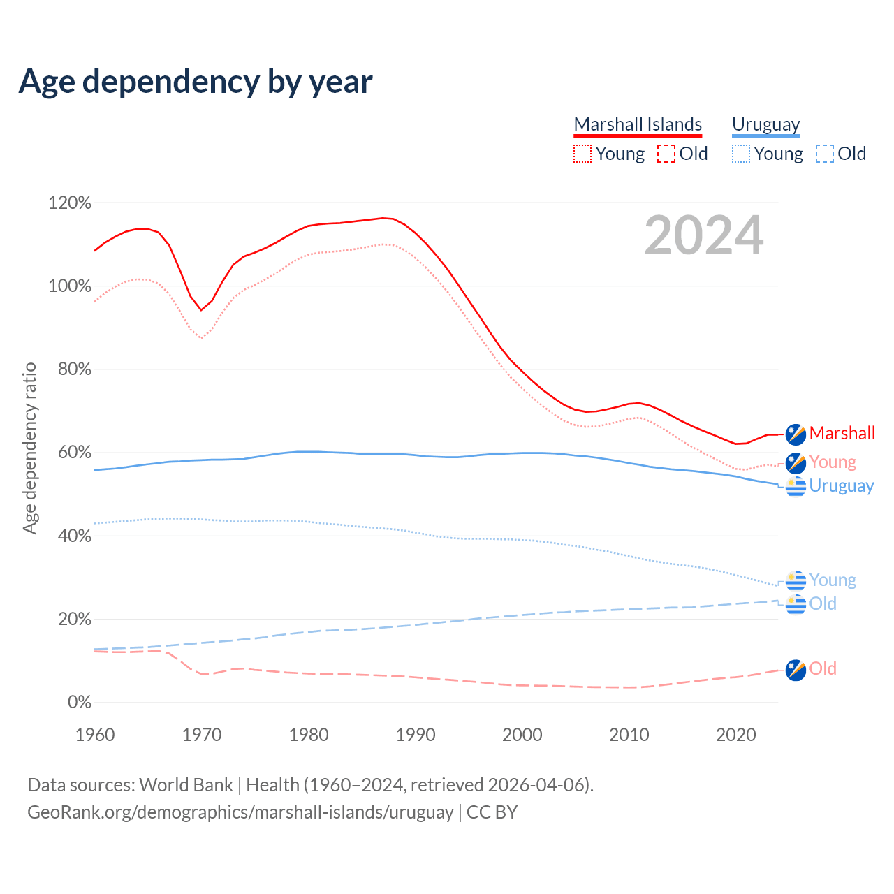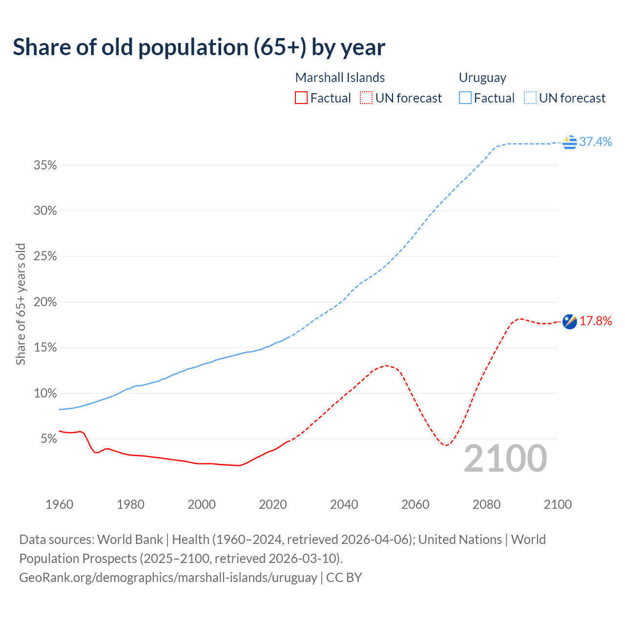 - The share of old-age demographic (65+) in the Marshall Islands is 4.64% vs 16% in Uruguay.