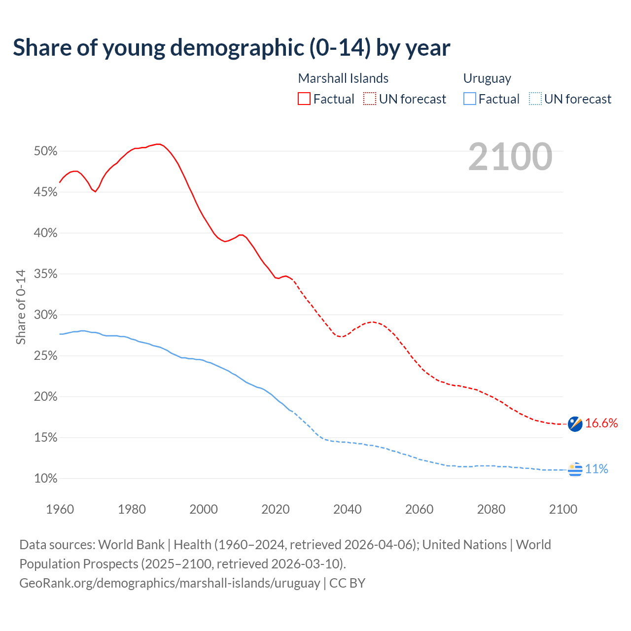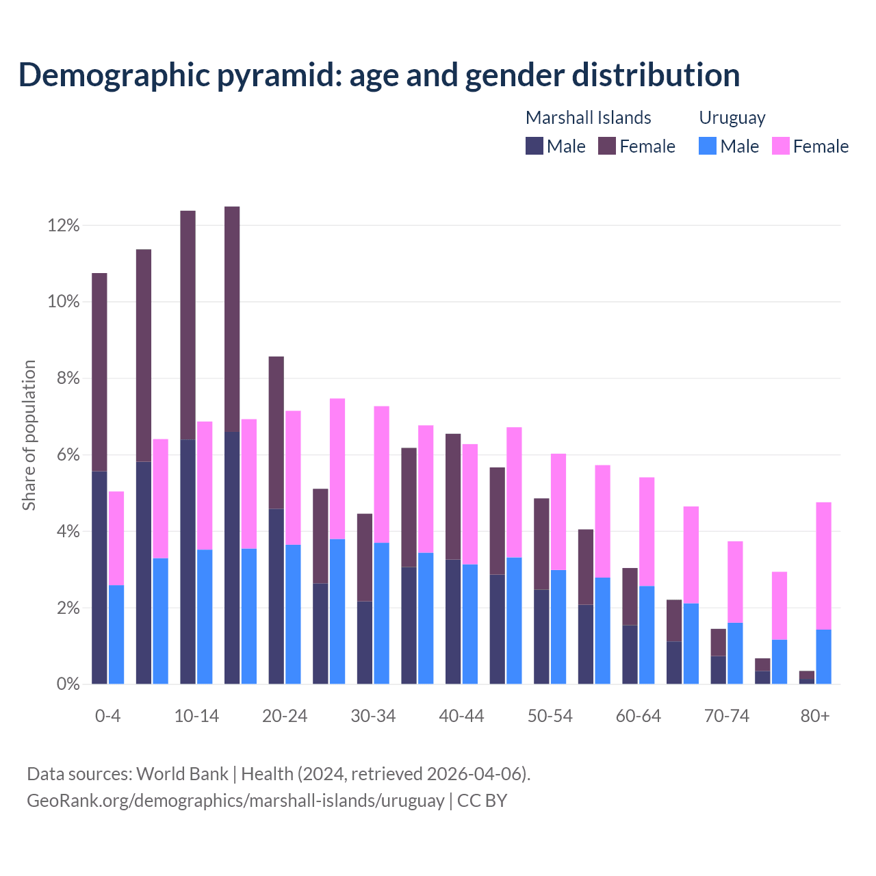 - The share of young demographic (0-15 years old) in the Marshall Islands is 34.5% vs 18.3% in Uruguay.
