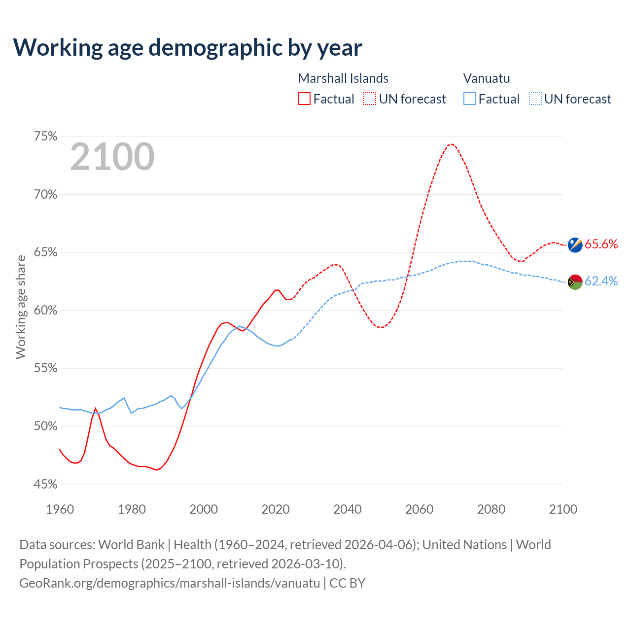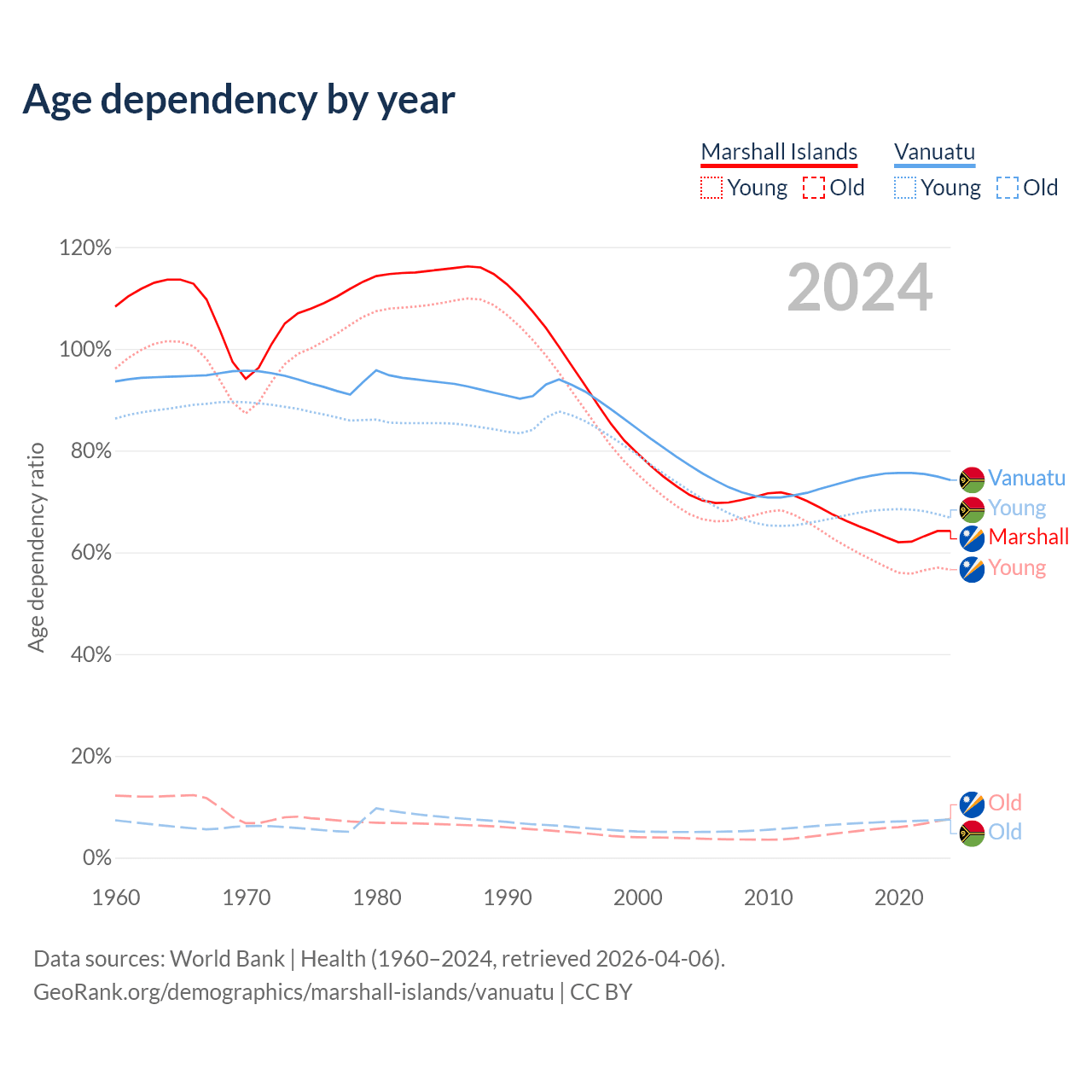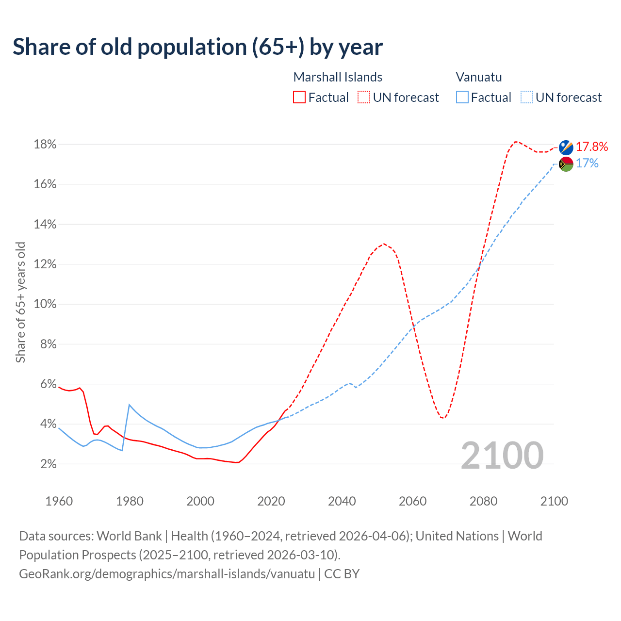 The share of older people aged 65 and over is 4.64% in the Marshall Islands and 4.3% in Vanuatu. Life expectancy in the Marshall Islands compared to Vanuatu .