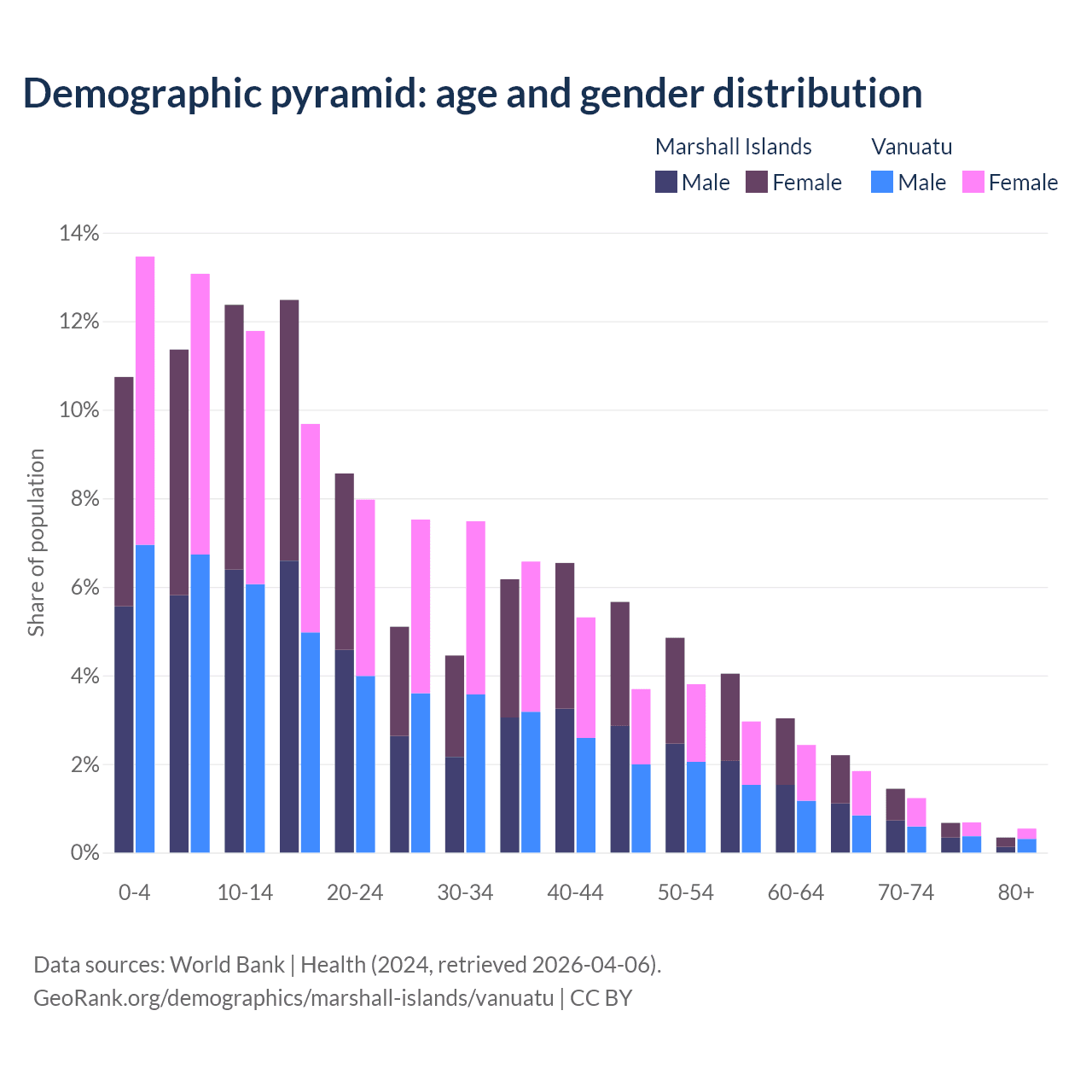 - The share of young demographic (0-15 years old) in the Marshall Islands is 34.5% vs 38.3% in Vanuatu.