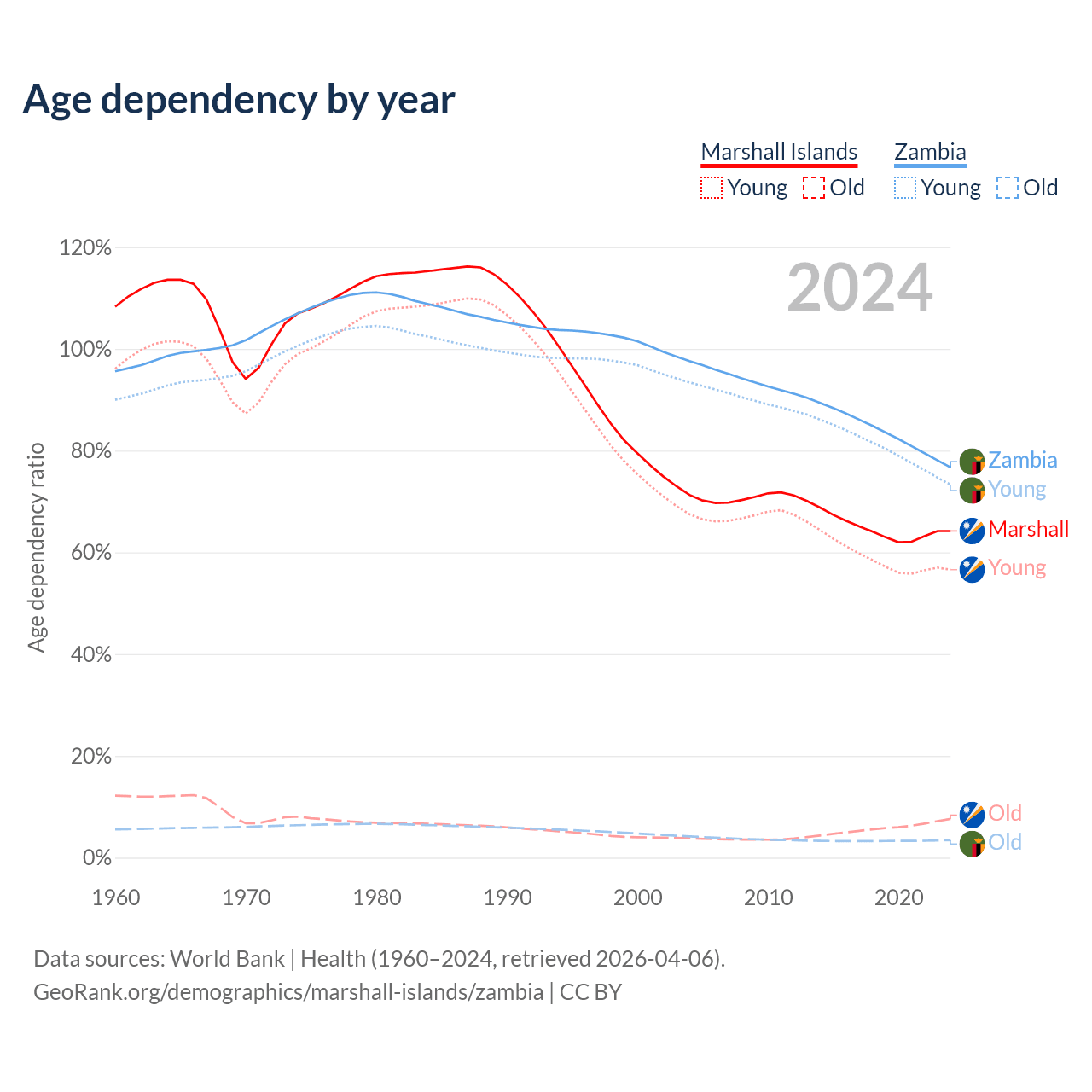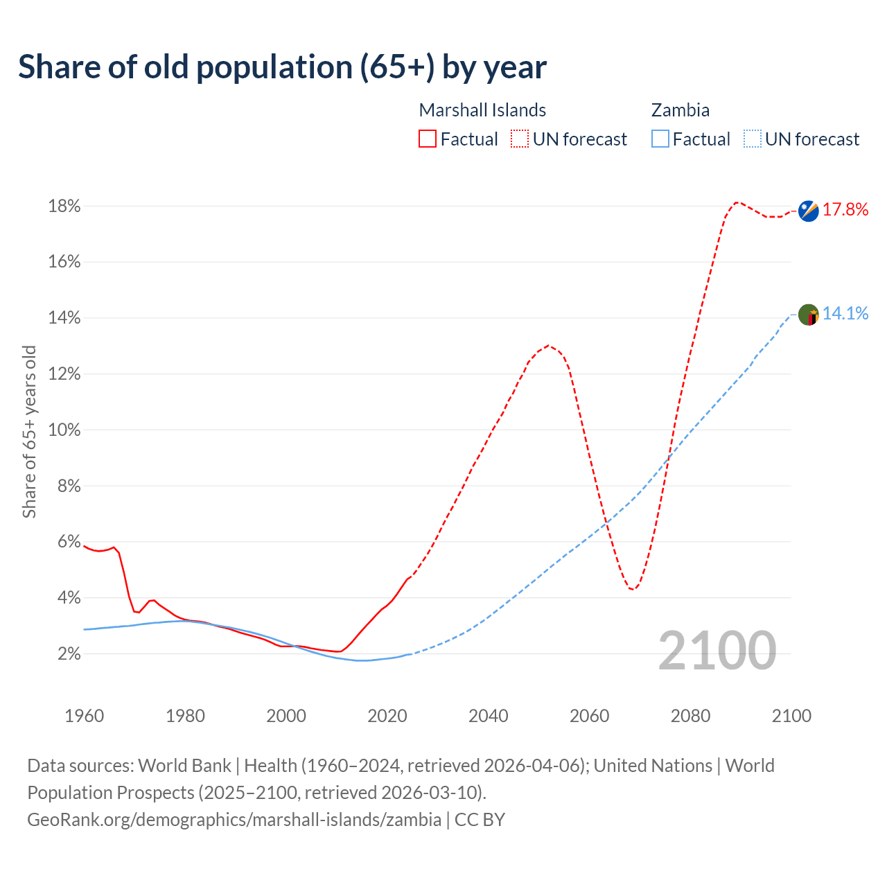 - The share of old-age demographic (65+) in the Marshall Islands is 4.64% vs 1.95% in Zambia.