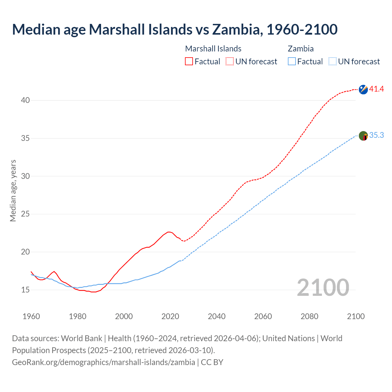 - The Marshall Islands is ranked 150/196 by median age (oldest to youngest) vs 182/196 for Zambia.
