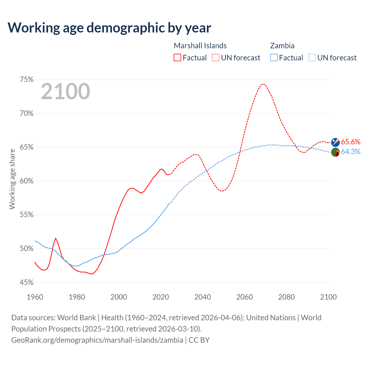 - The Marshall Islands has 21.3K working age adults (aged 15-64) vs 12.8M in Zambia.