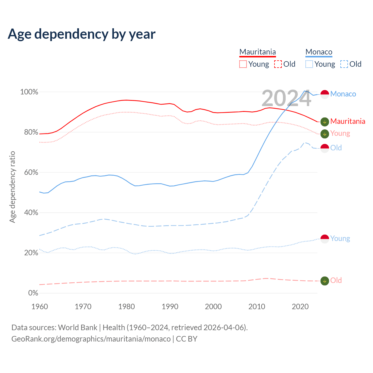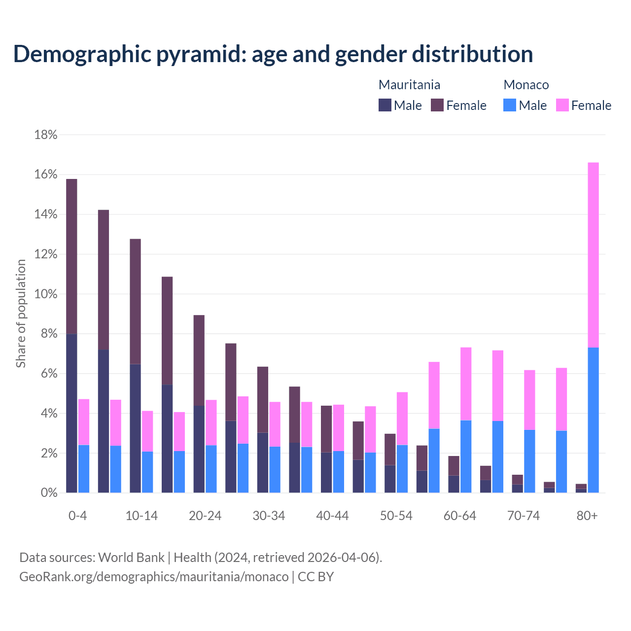 - The share of old-age demographic (65+) in Mauritania is 3.23% vs 36.2% in Monaco.