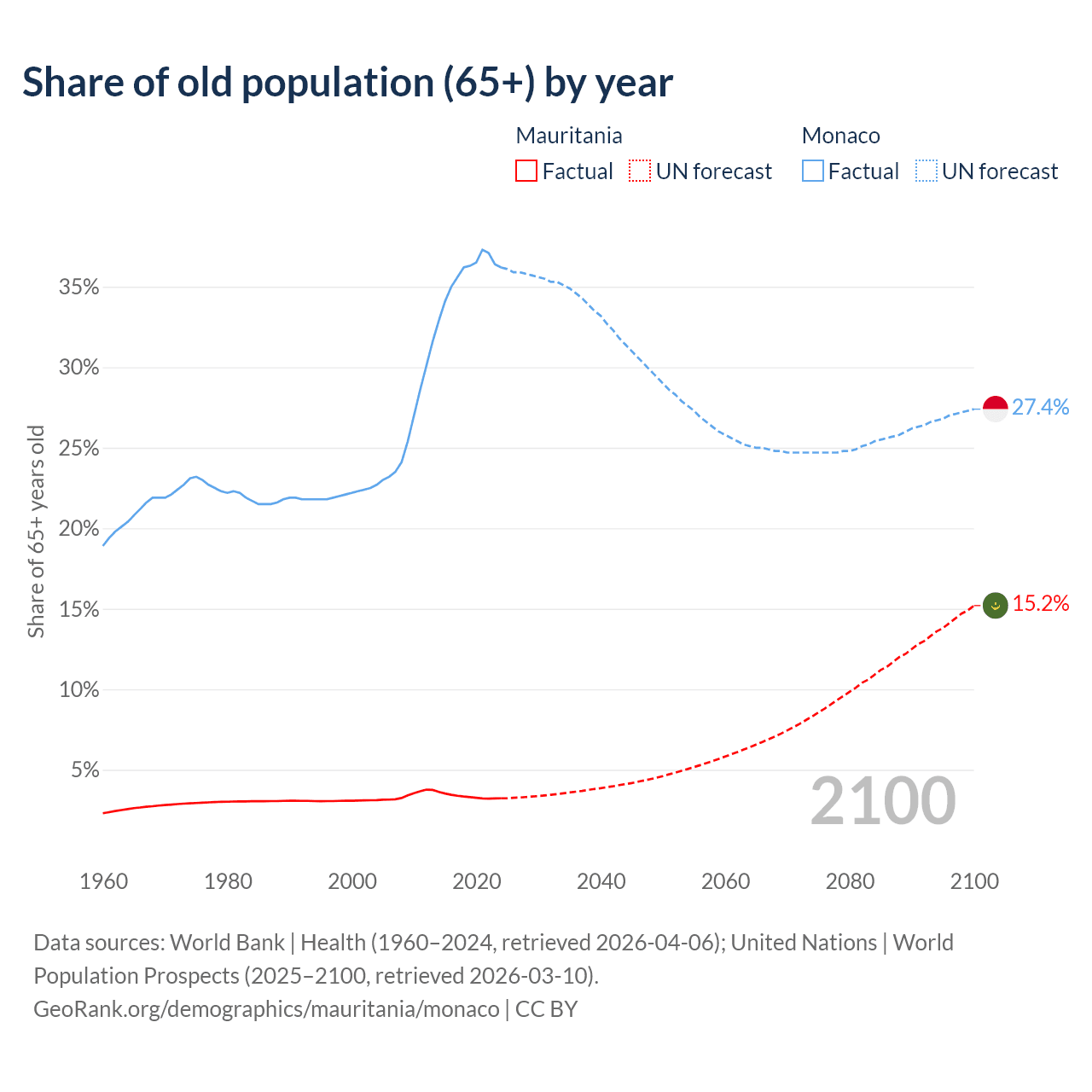 The share of older people aged 65 and over is 3.23% in Mauritania and 36.2% in Monaco. Life expectancy in Mauritania compared to Monaco .