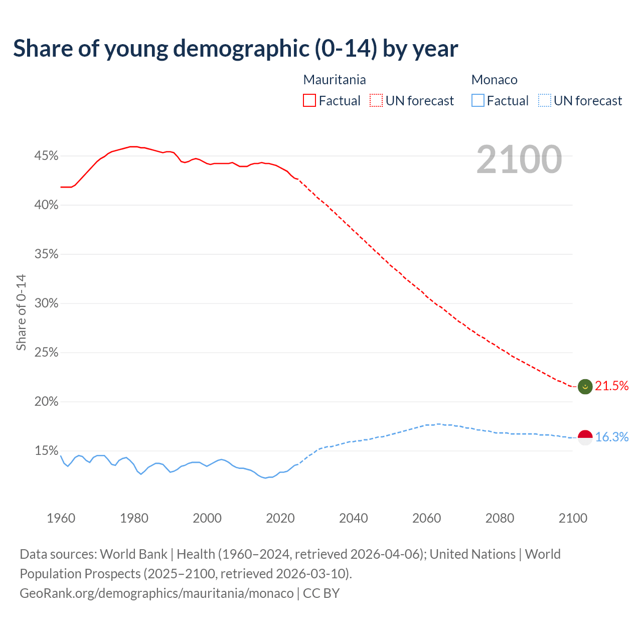- The share of young demographic (0-15 years old) in Mauritania is 42.7% vs 13.5% in Monaco.