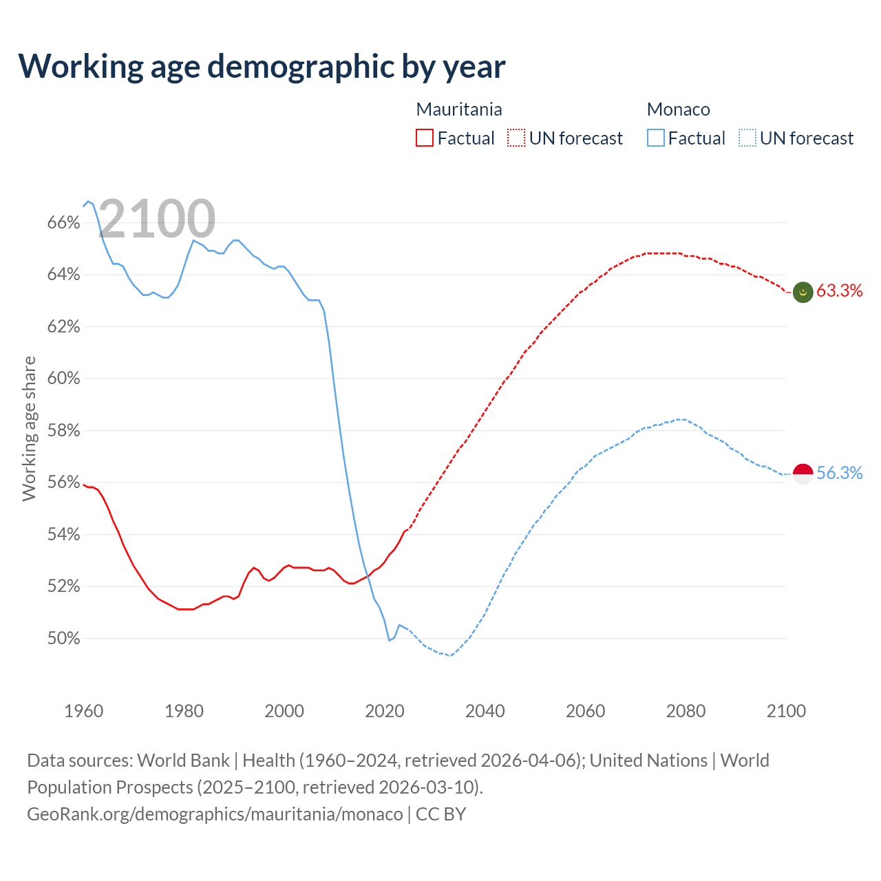 - Mauritania has 2.98M working age adults (aged 15-64) vs 19.2K in Monaco.