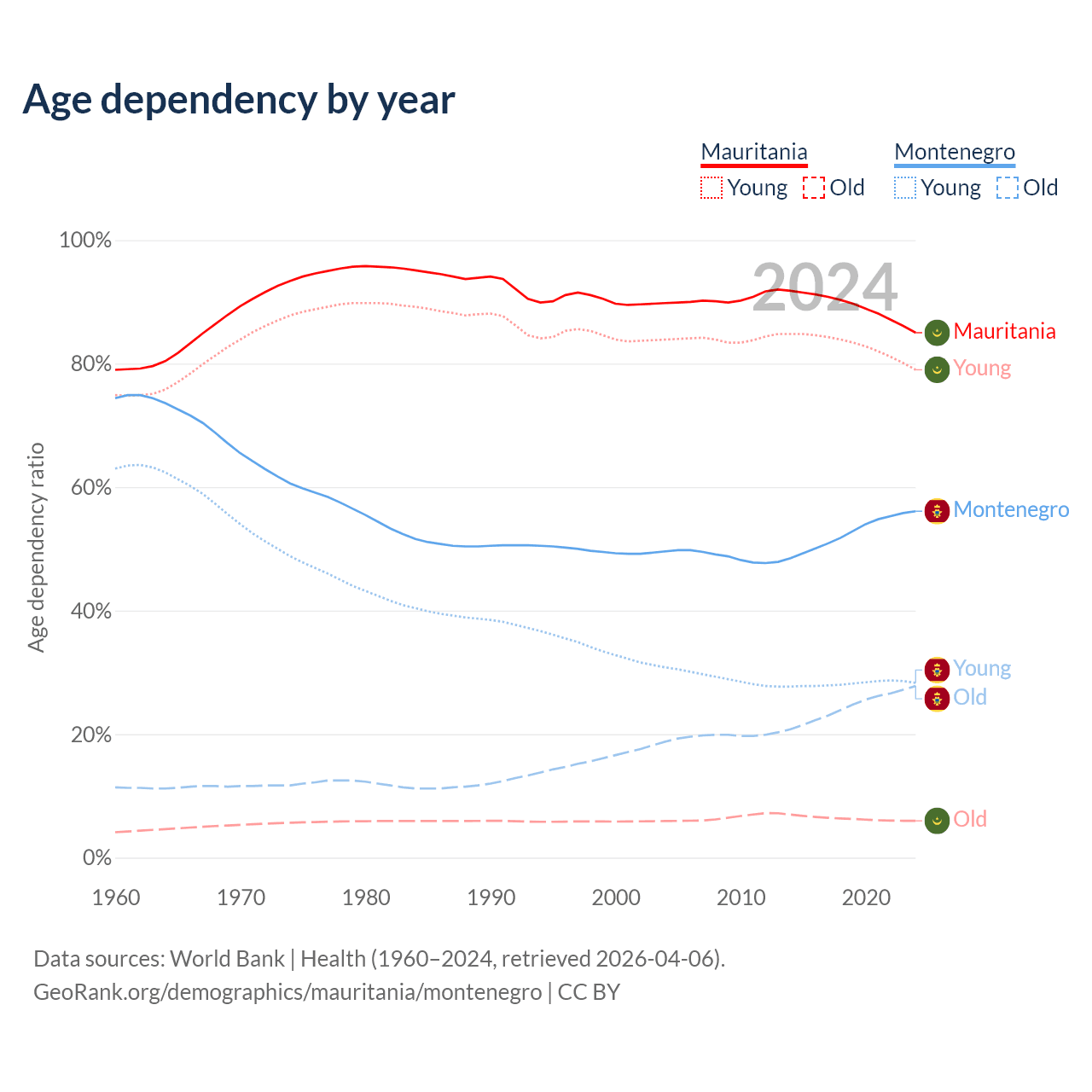 - The share of old-age demographic (65+) in Mauritania is 3.23% vs 17.8% in Montenegro.