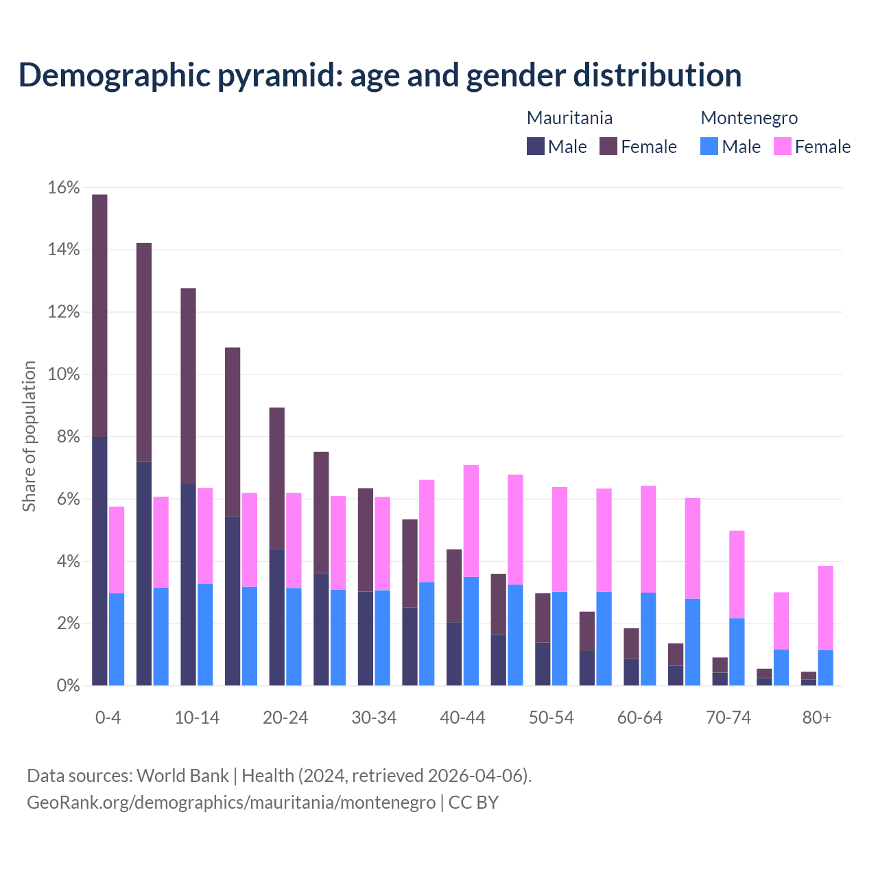 - The share of young demographic (0-15 years old) in Mauritania is 42.7% vs 18.1% in Montenegro.