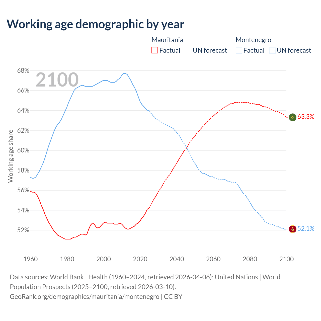- Mauritania has 2.98M working age adults (aged 15-64) vs 392K in Montenegro.