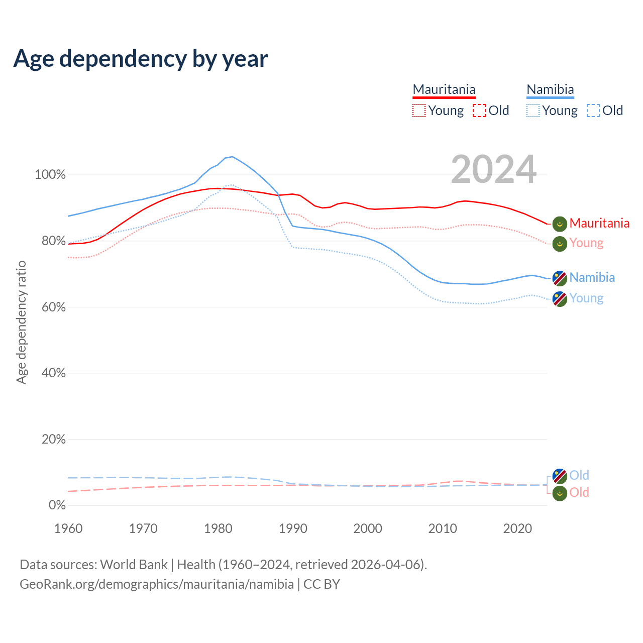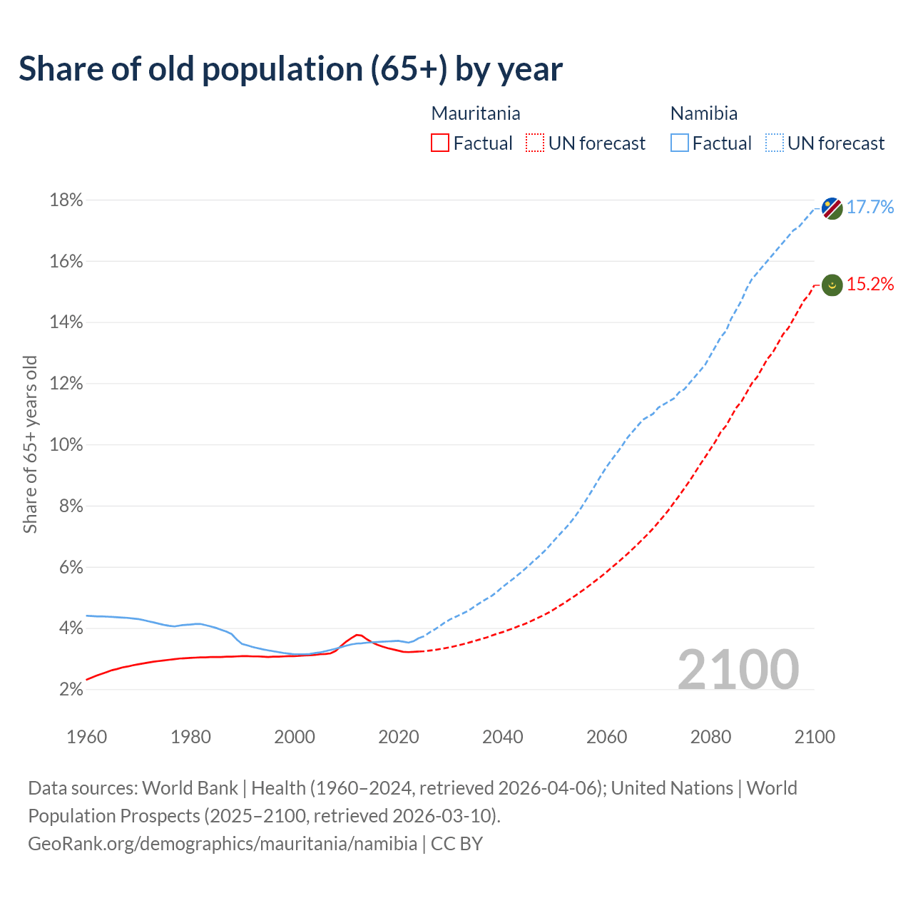 The share of older people aged 65 and over is 3.23% in Mauritania and 3.67% in Namibia. Life expectancy in Mauritania compared to Namibia .