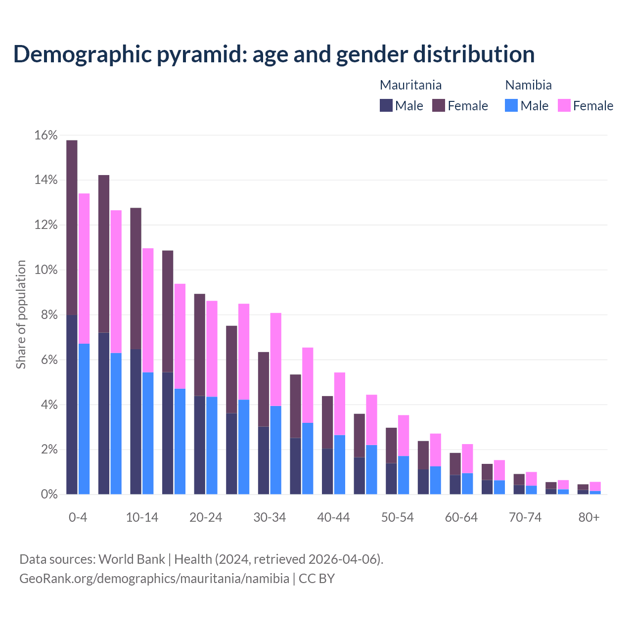- The share of old-age demographic (65+) in Mauritania is 3.23% vs 3.67% in Namibia.
