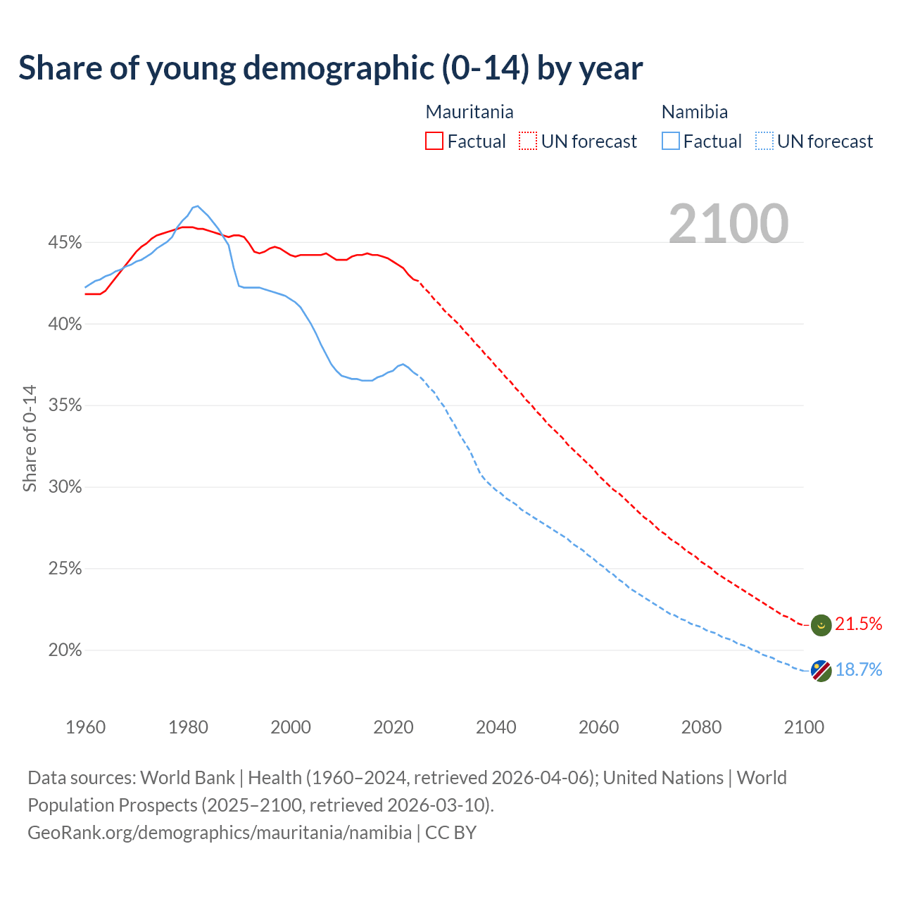 Median age Mauritania vs Namibia, 1960-2100