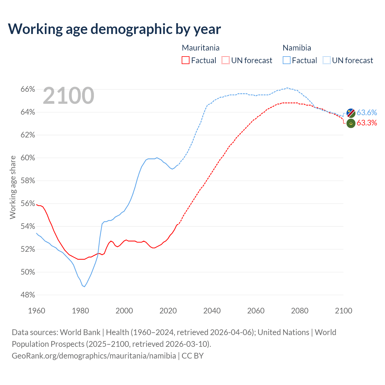 - Mauritania has 2.98M working age adults (aged 15-64) vs 1.88M in Namibia.