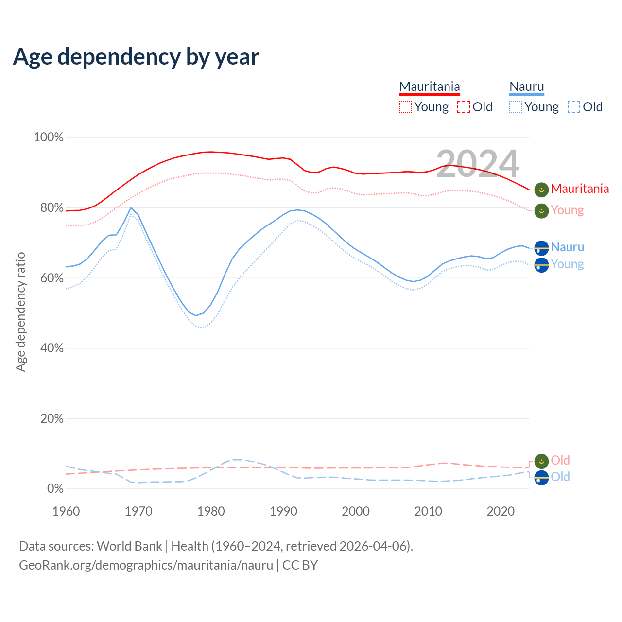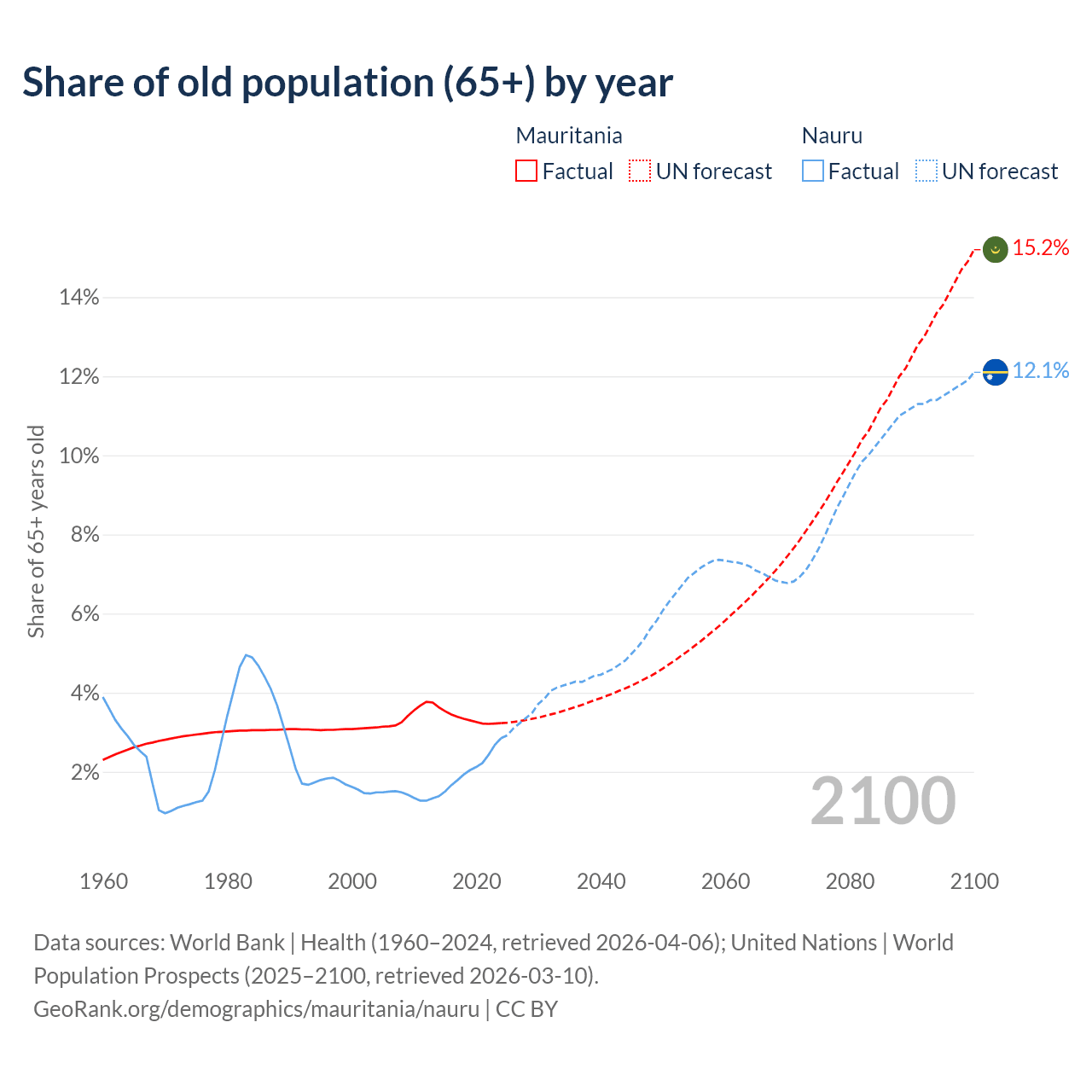 - The share of old-age demographic (65+) in Mauritania is 3.23% vs 2.85% in Nauru.