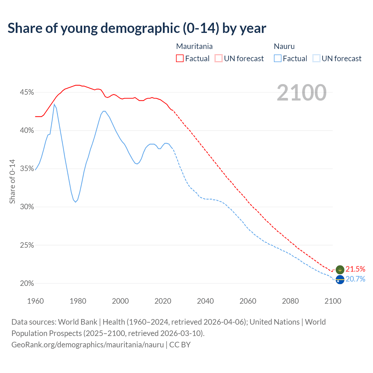 - The share of young demographic (0-15 years old) in Mauritania is 42.7% vs 37.8% in Nauru.