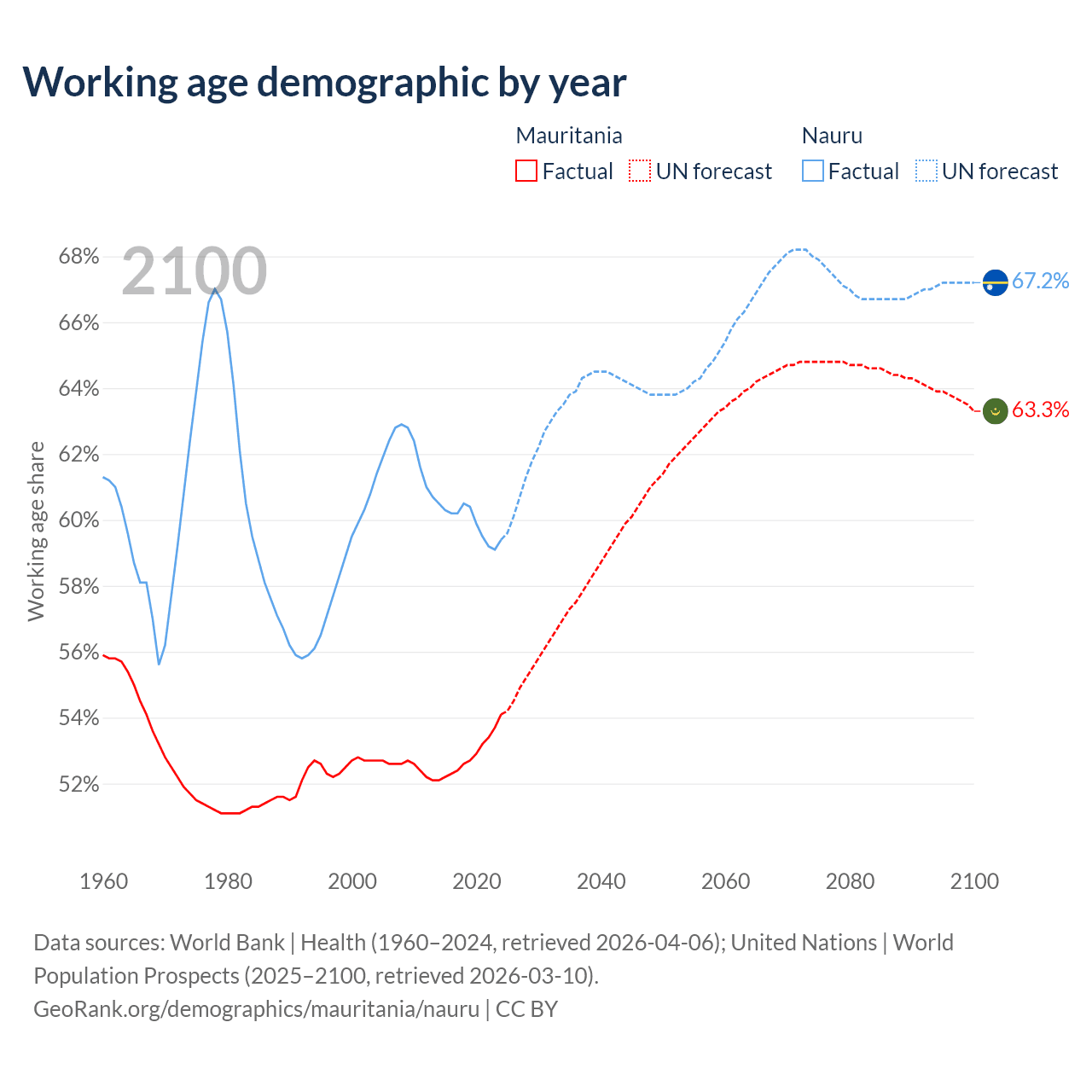 - Mauritania has 2.98M working age adults (aged 15-64) vs 7.2K in Nauru.