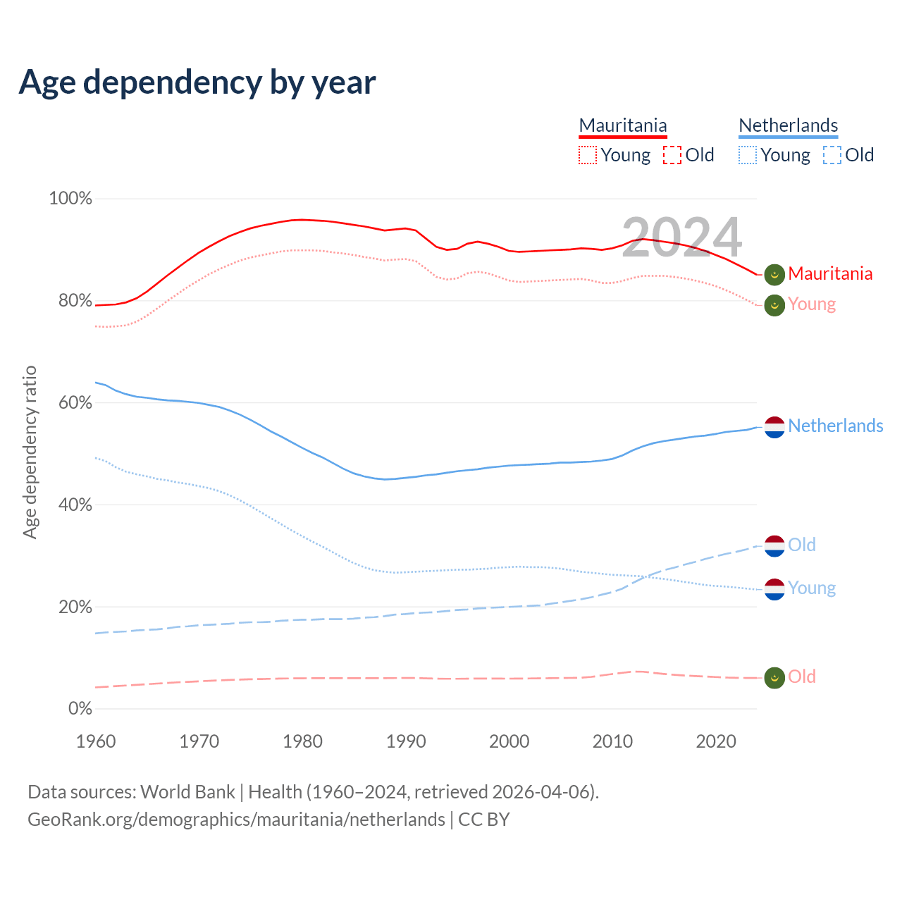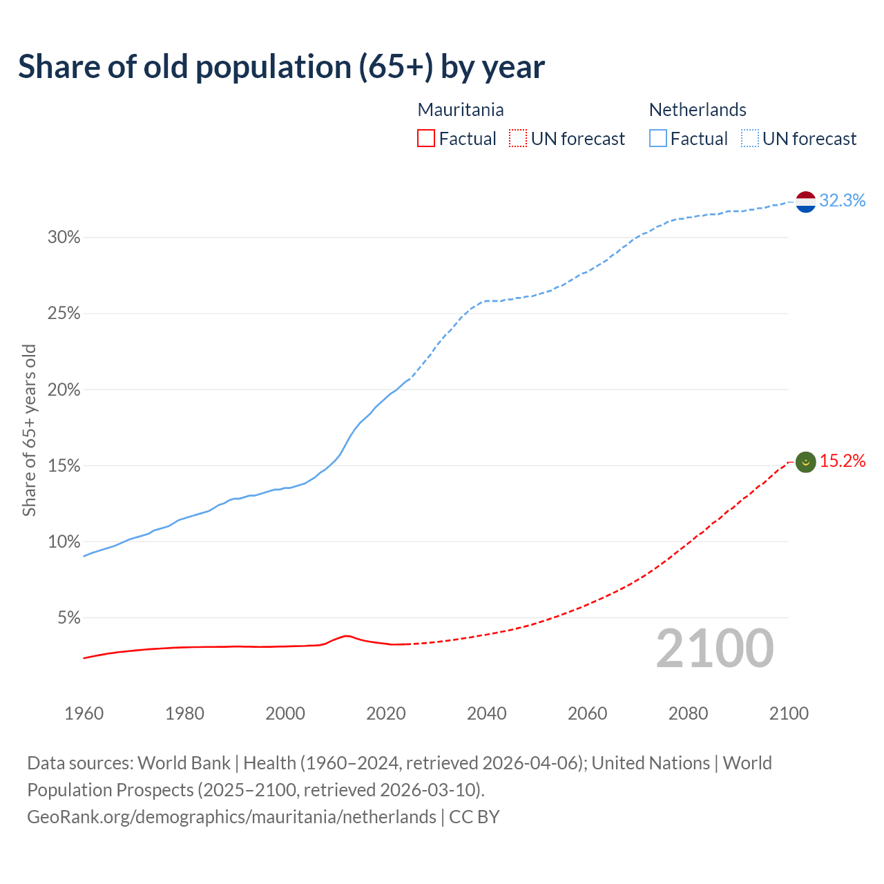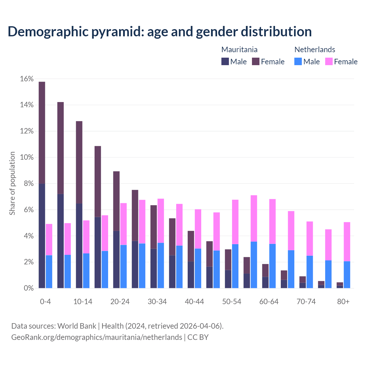 - The share of old-age demographic (65+) in Mauritania is 3.23% vs 20.5% in the Netherlands.