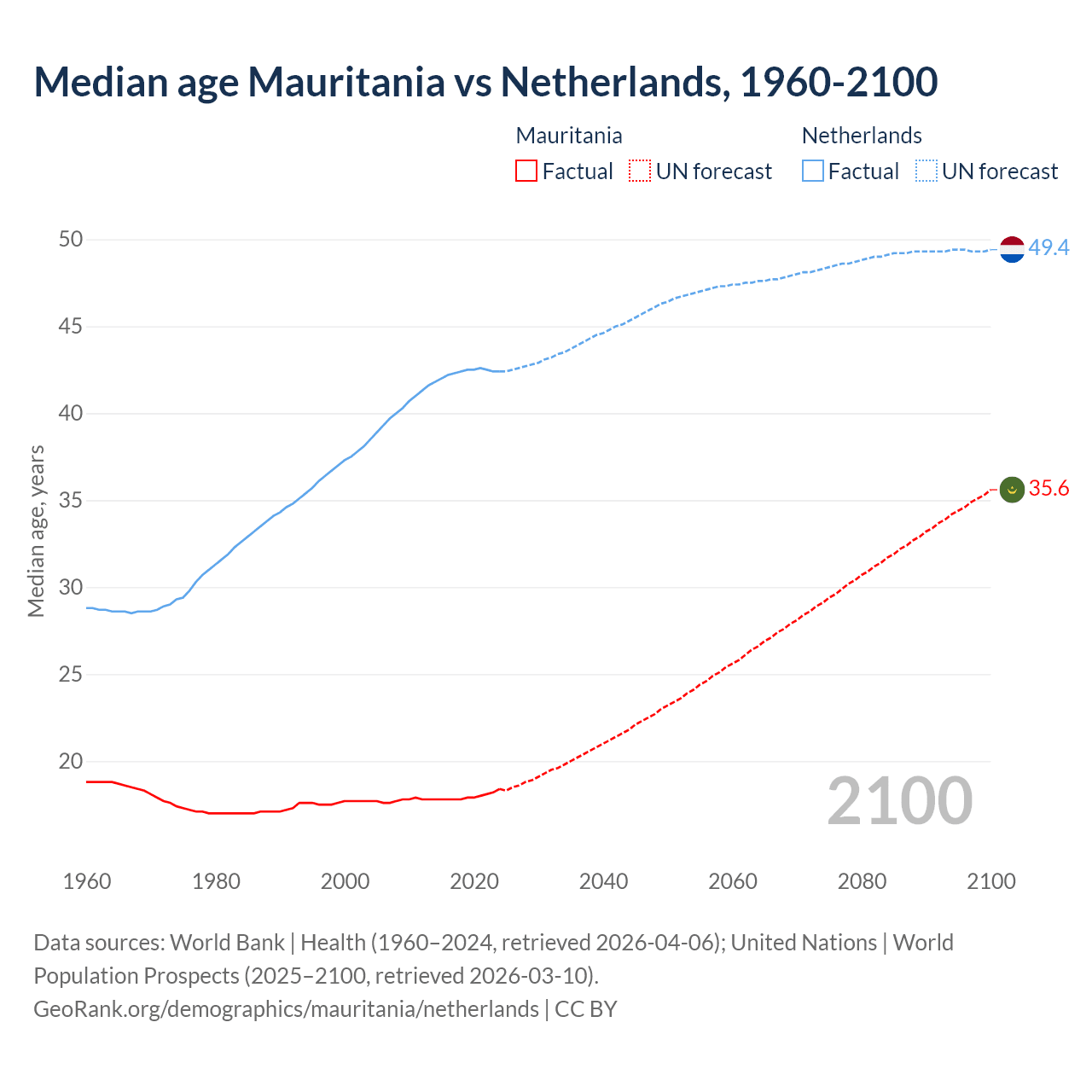 - Mauritania is ranked 185/196 by median age (oldest to youngest) vs 33/196 for the Netherlands.