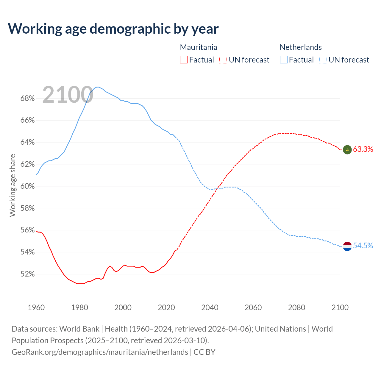 - Mauritania has 2.98M working age adults (aged 15-64) vs 11.8M in the Netherlands.
