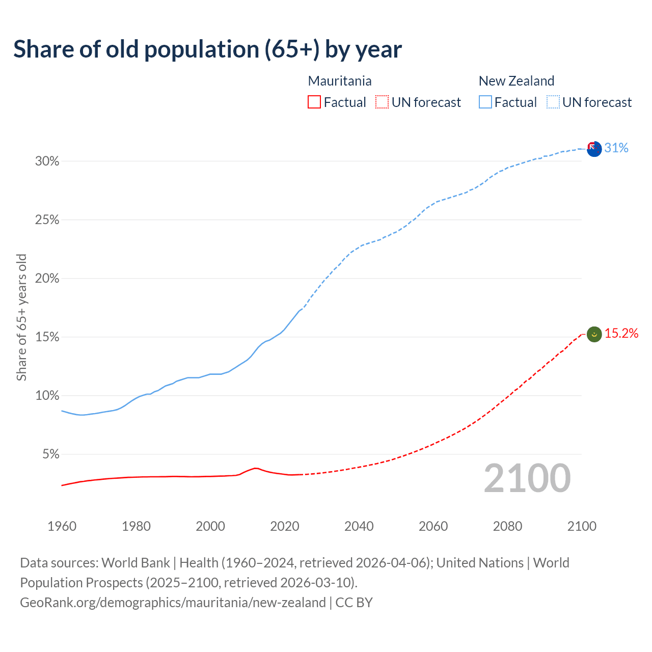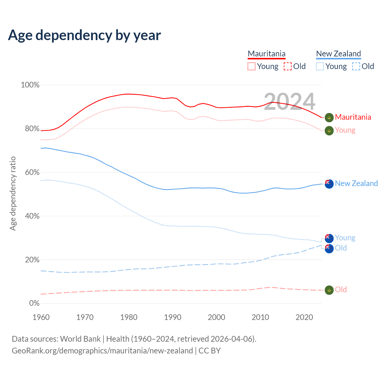 - The share of old-age demographic (65+) in Mauritania is 3.23% vs 17.2% in New Zealand.