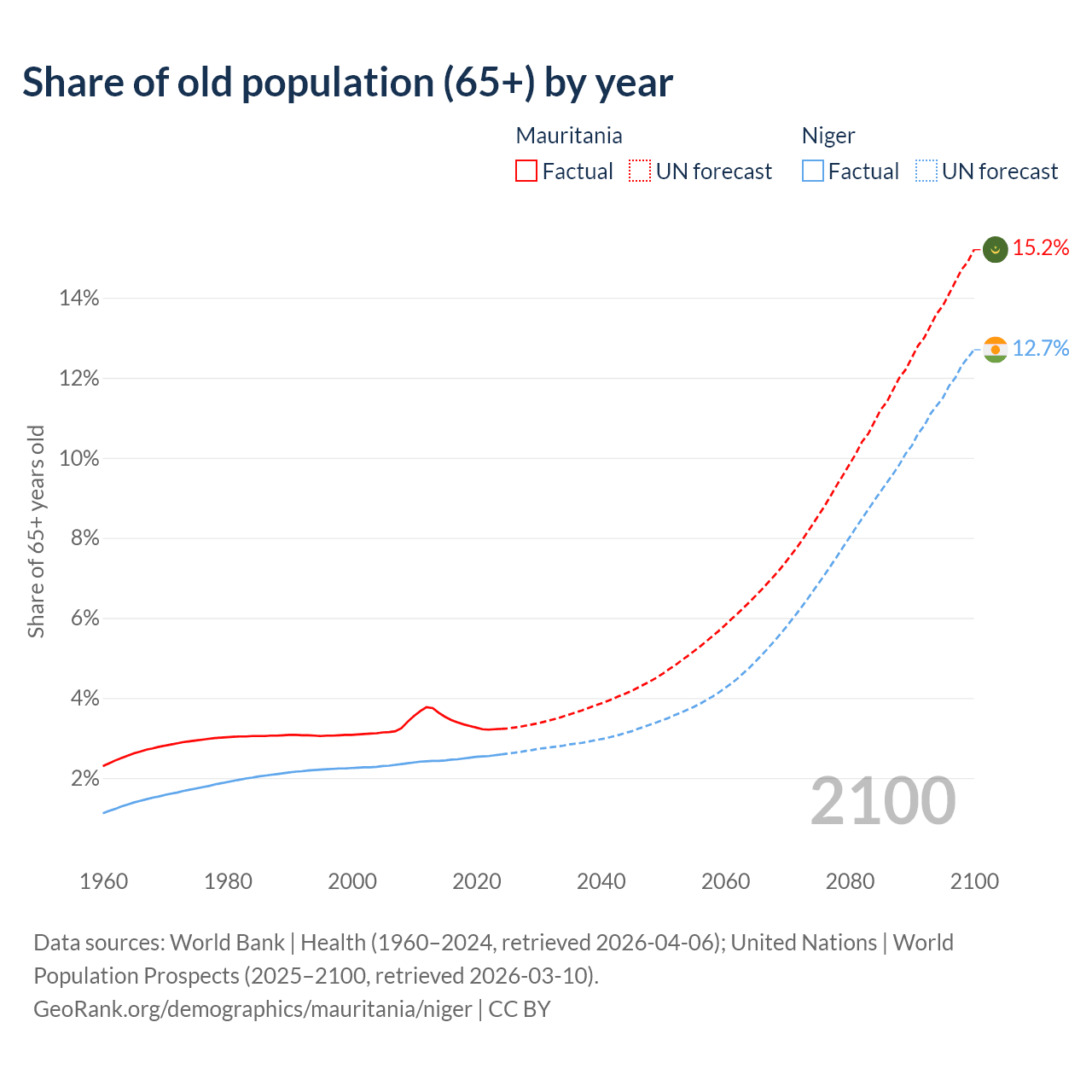 - The share of old-age demographic (65+) in Mauritania is 3.23% vs 2.59% in Niger.