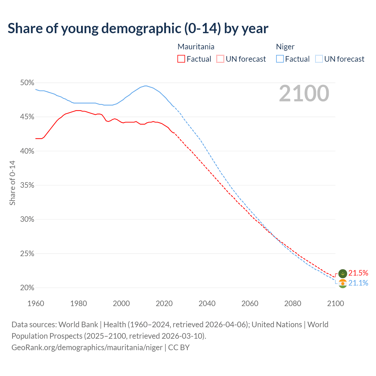 Median age Mauritania vs Niger, 1960-2100