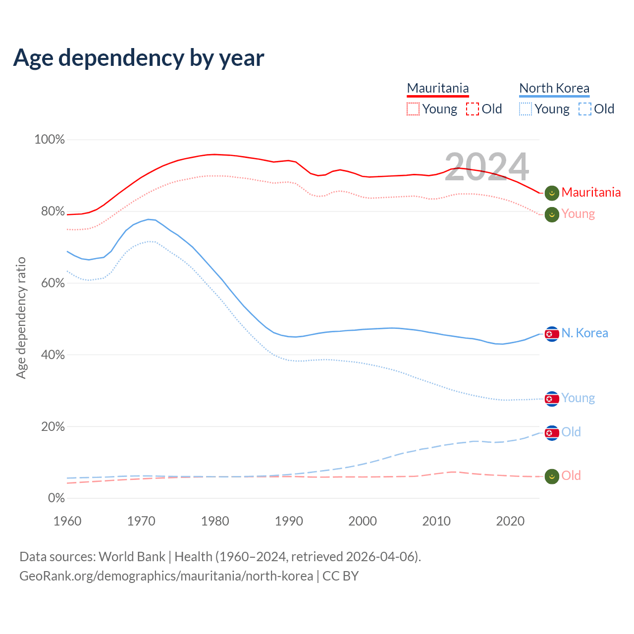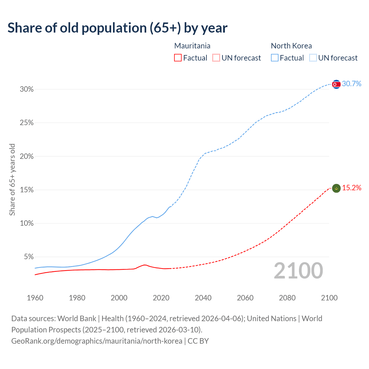 The share of older people aged 65 and over is 3.23% in Mauritania and 12.4% in North Korea. Life expectancy in Mauritania compared to North Korea .