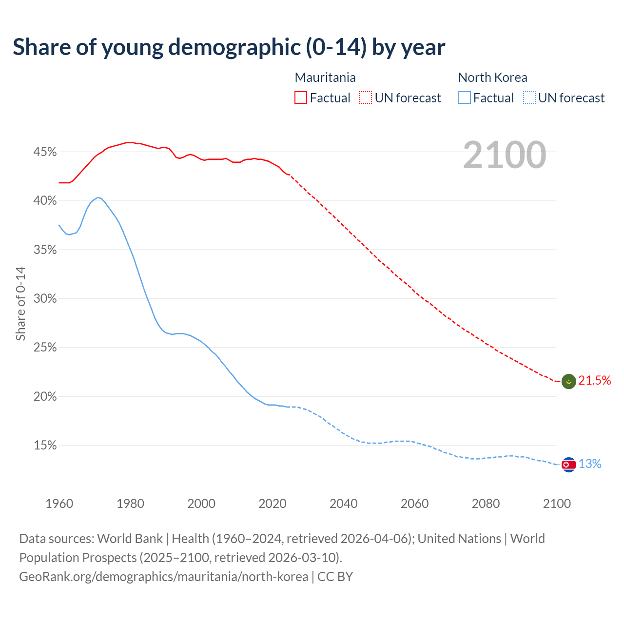 - The share of young demographic (0-15 years old) in Mauritania is 42.7% vs 18.9% in North Korea.
