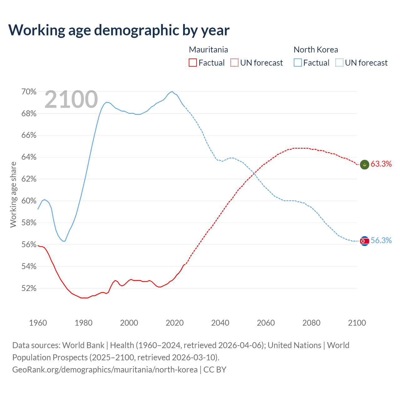 - Mauritania has 2.98M working age adults (aged 15-64) vs 18.3M in North Korea.