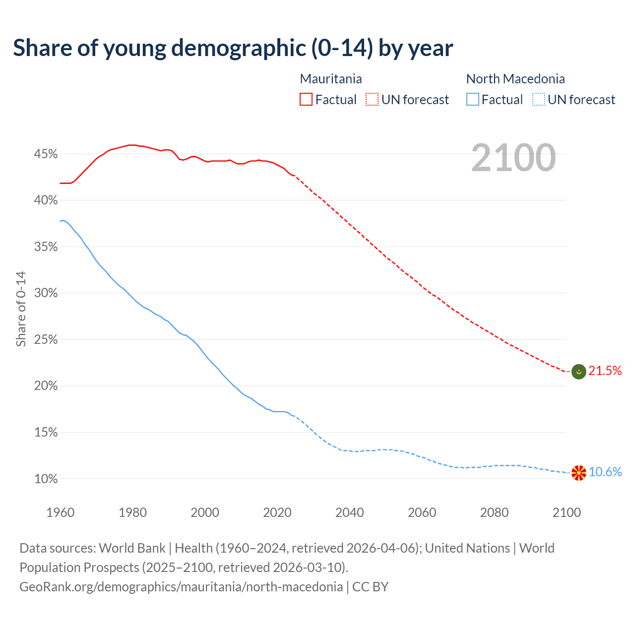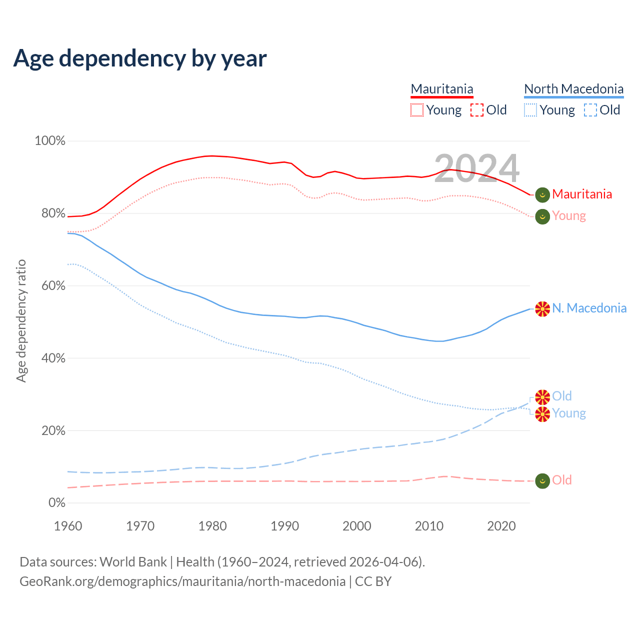 - The share of young demographic (0-15 years old) in Mauritania is 42.7% vs 16.8% in North Macedonia.