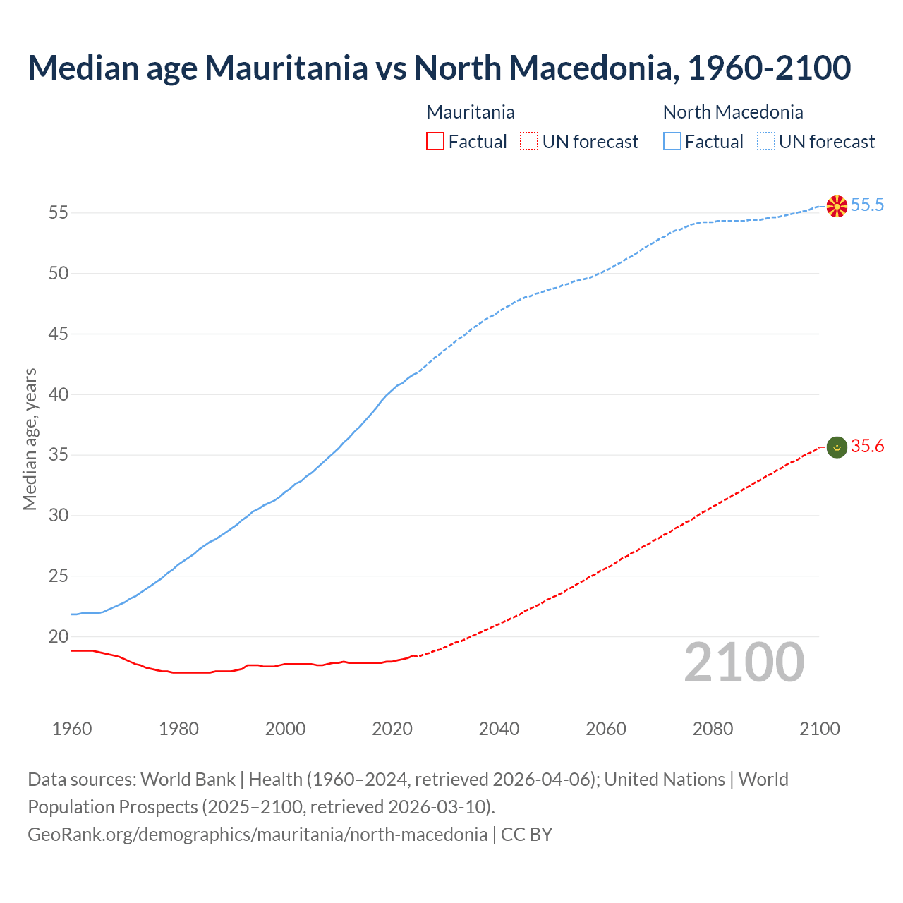 Median age Mauritania vs North Macedonia, 1960-2100