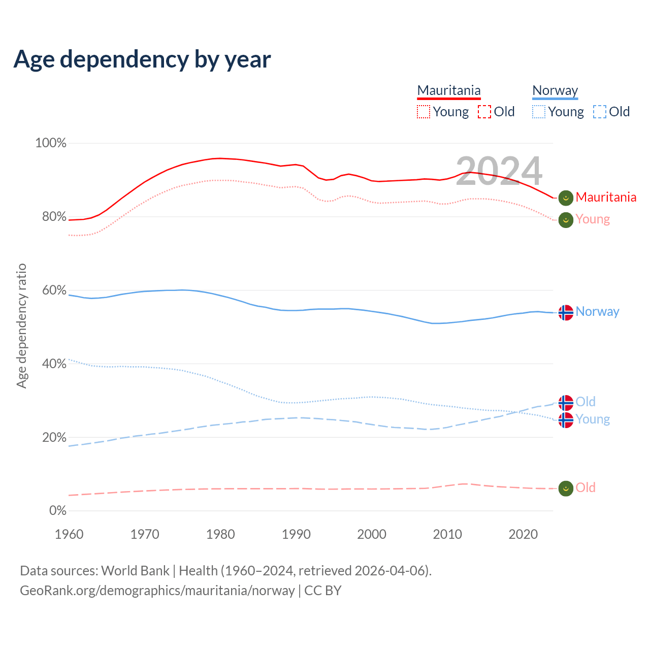 The share of older people aged 65 and over is 3.23% in Mauritania and 18.8% in Norway. Life expectancy in Mauritania compared to Norway .