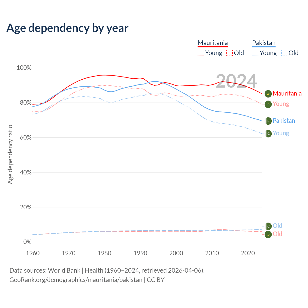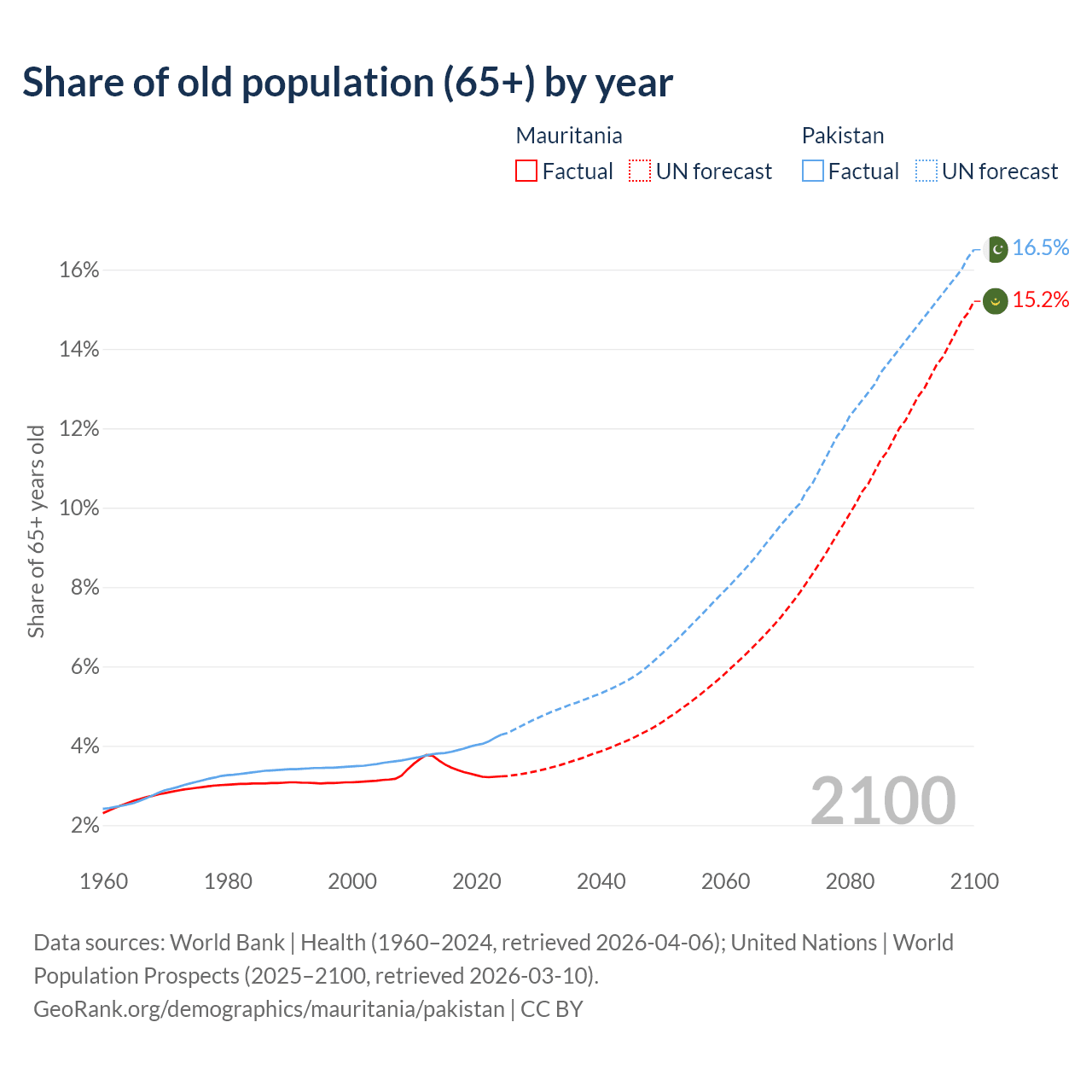 - The share of old-age demographic (65+) in Mauritania is 3.23% vs 4.28% in Pakistan.