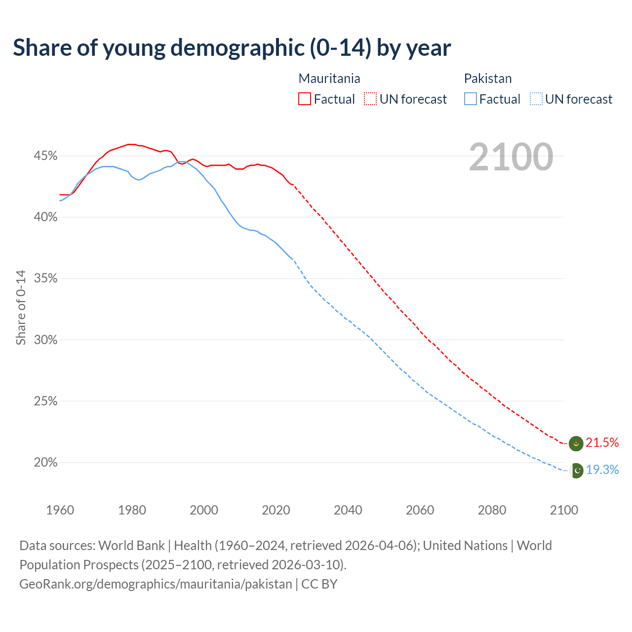 - The share of young demographic (0-15 years old) in Mauritania is 42.7% vs 36.7% in Pakistan.