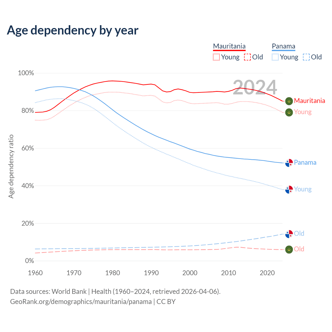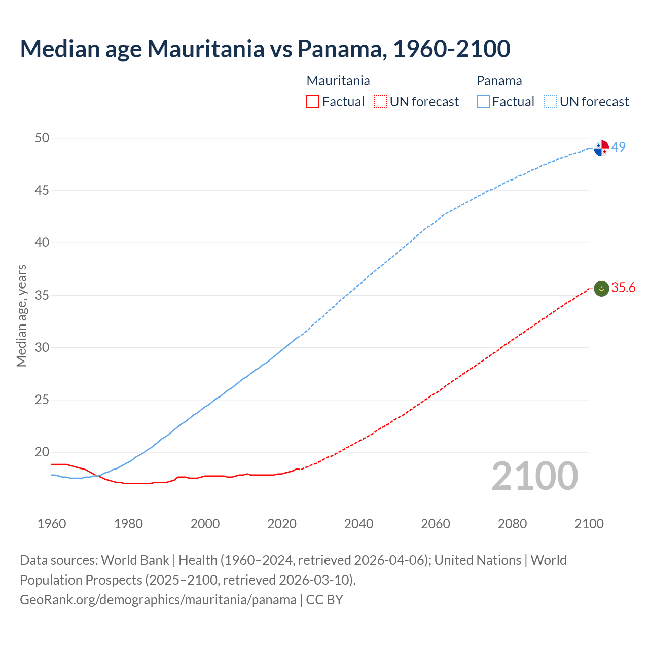 - Mauritania is ranked 185/196 by median age (oldest to youngest) vs 94/196 for Panama.