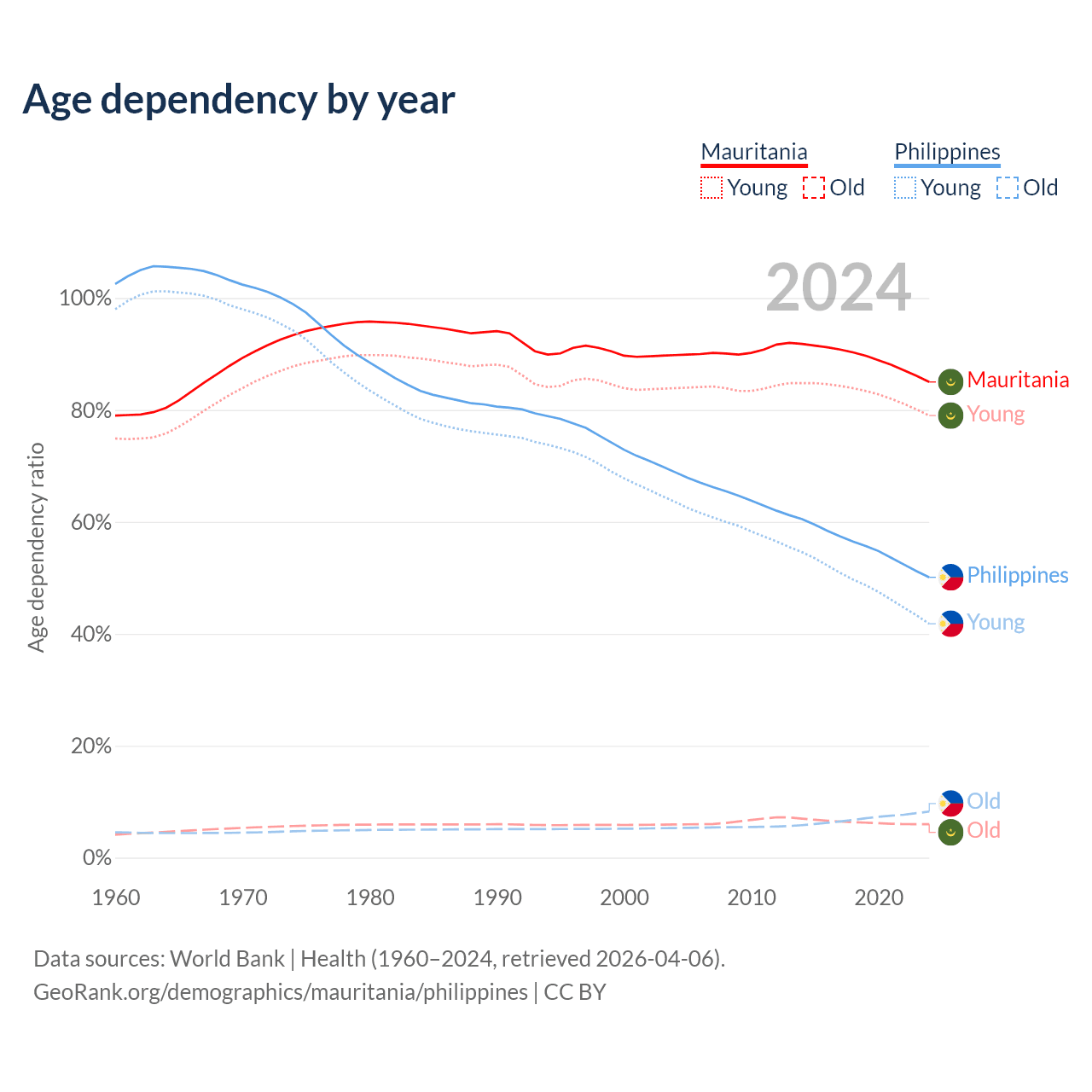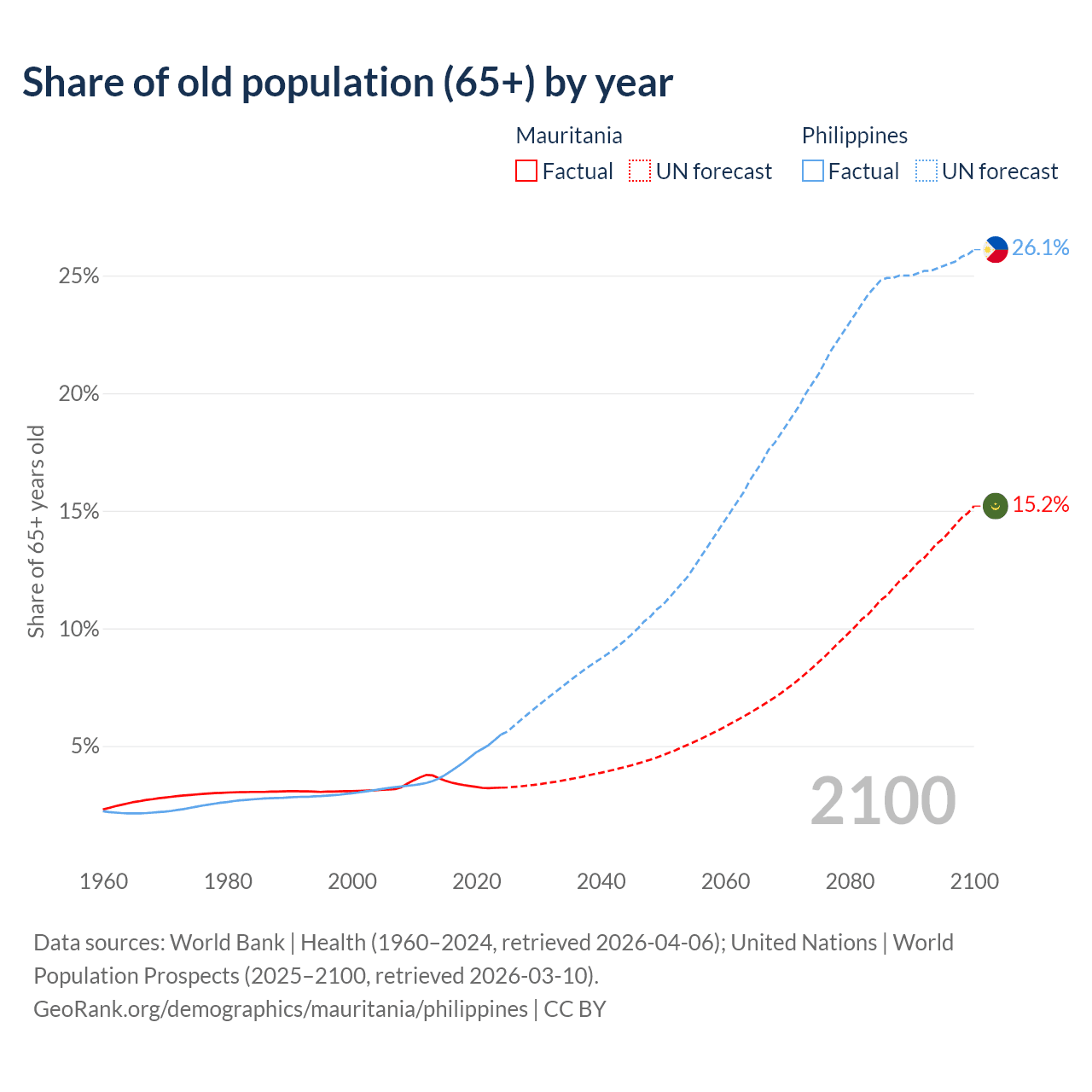 - The share of old-age demographic (65+) in Mauritania is 3.23% vs 5.49% in the Philippines.