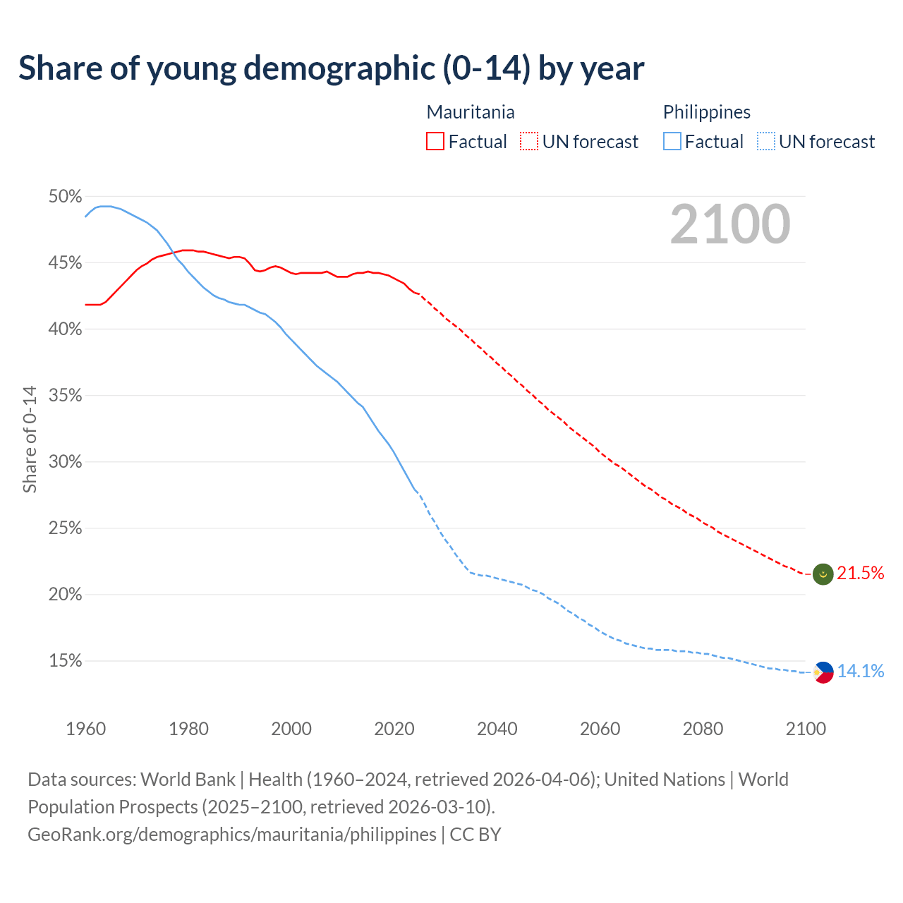 - The share of young demographic (0-15 years old) in Mauritania is 42.7% vs 27.9% in the Philippines.