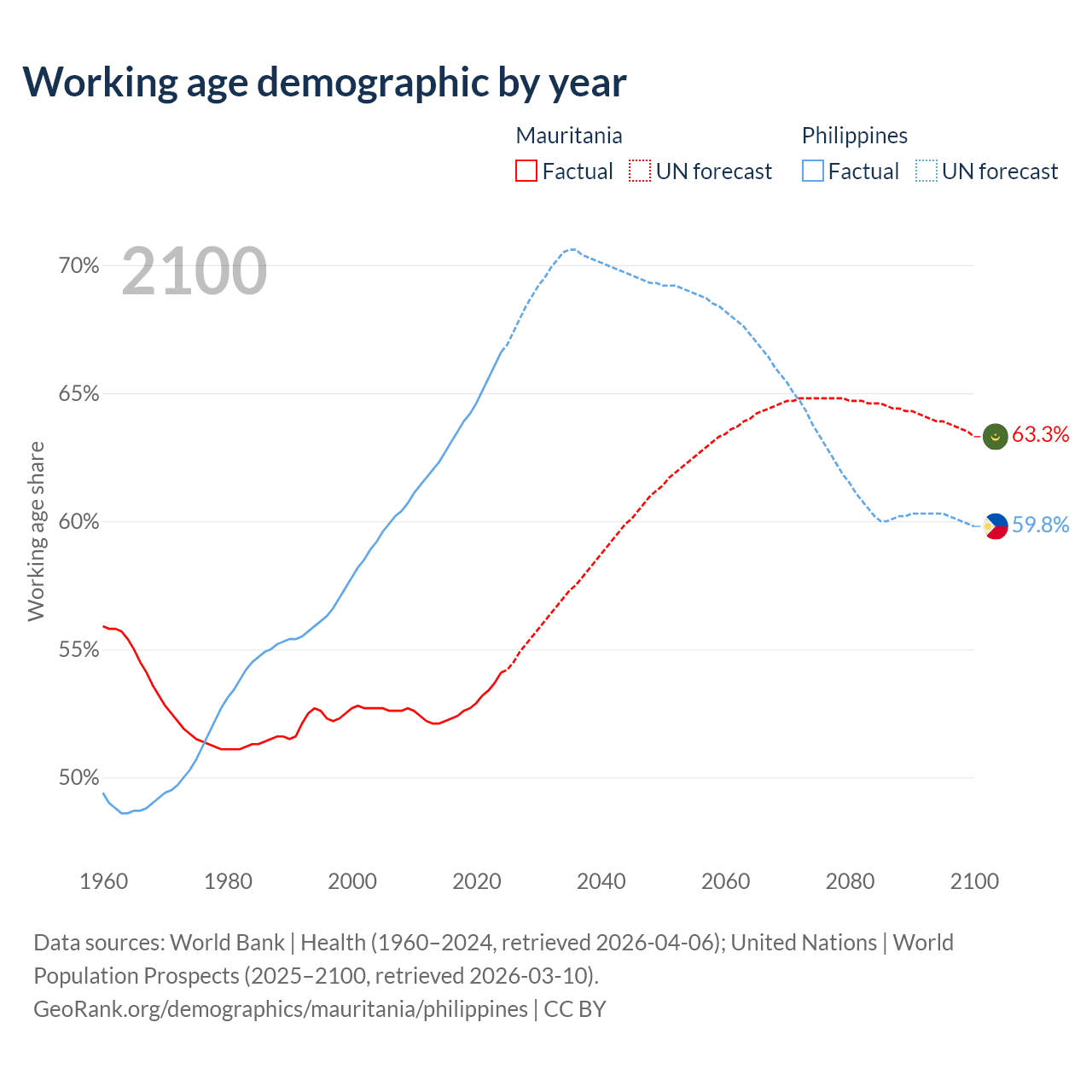 - Mauritania has 2.98M working age adults (aged 15-64) vs 78.6M in the Philippines.