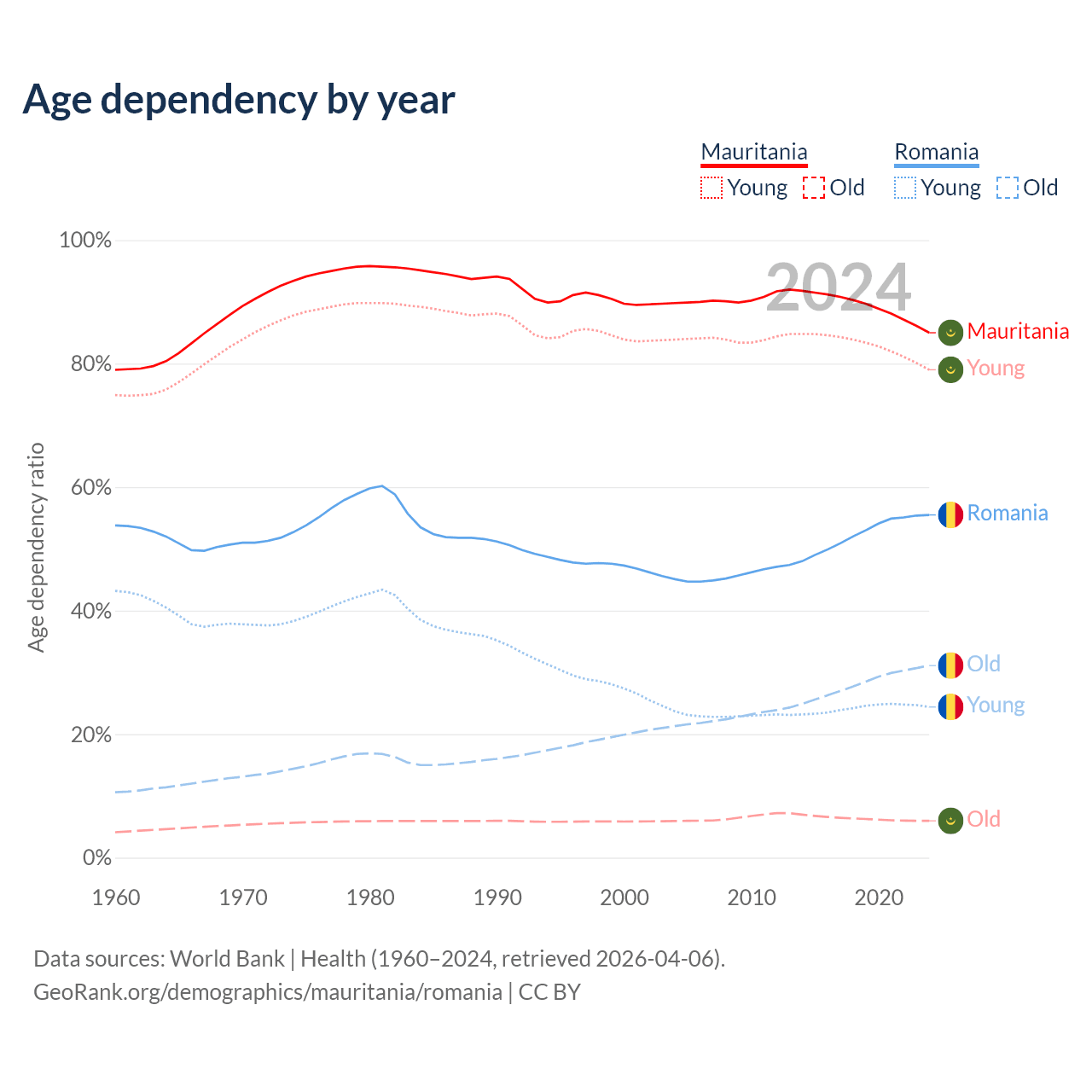 - The share of old-age demographic (65+) in Mauritania is 3.23% vs 20% in Romania.