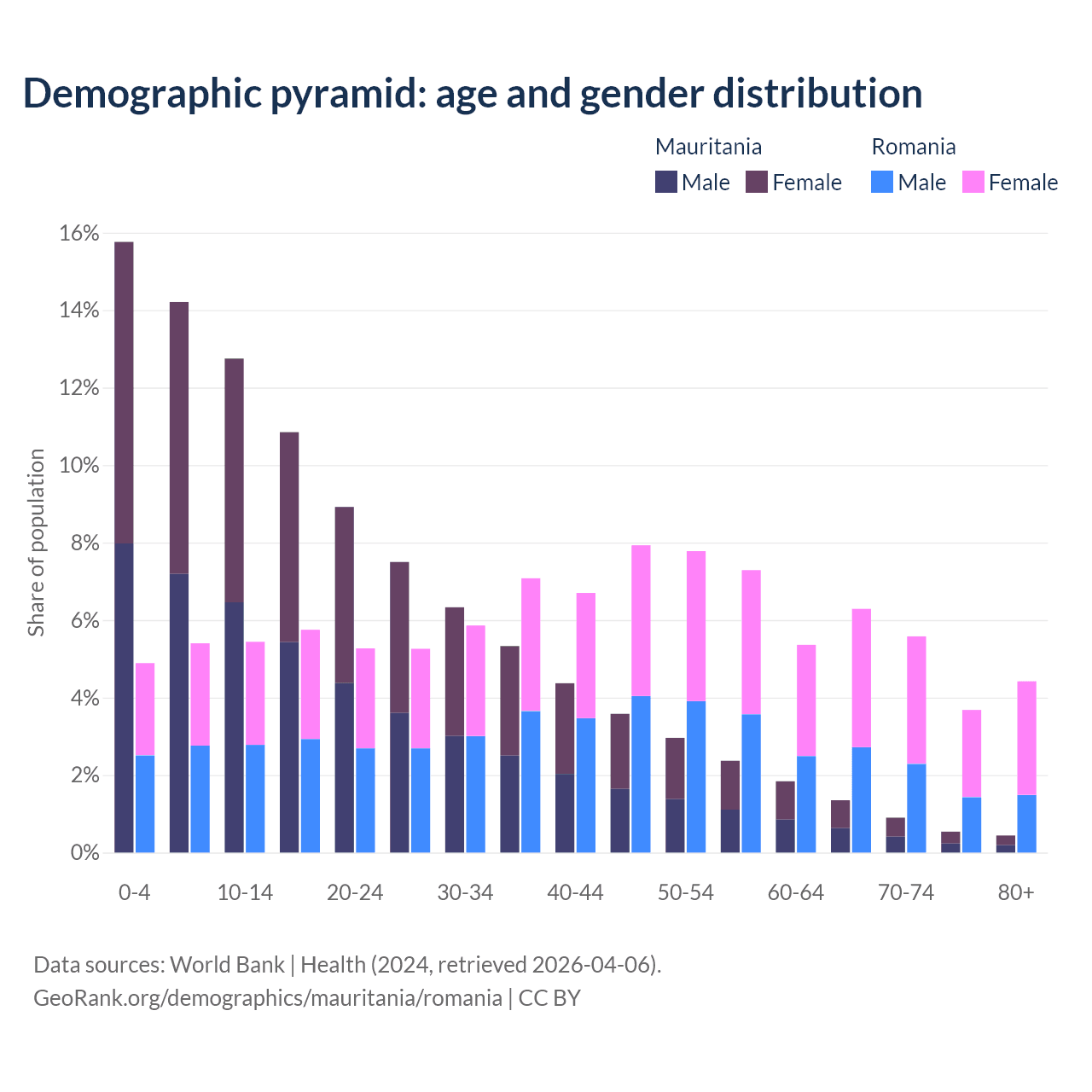 - Mauritania is ranked 185/196 by median age (oldest to youngest) vs 23/196 for Romania.