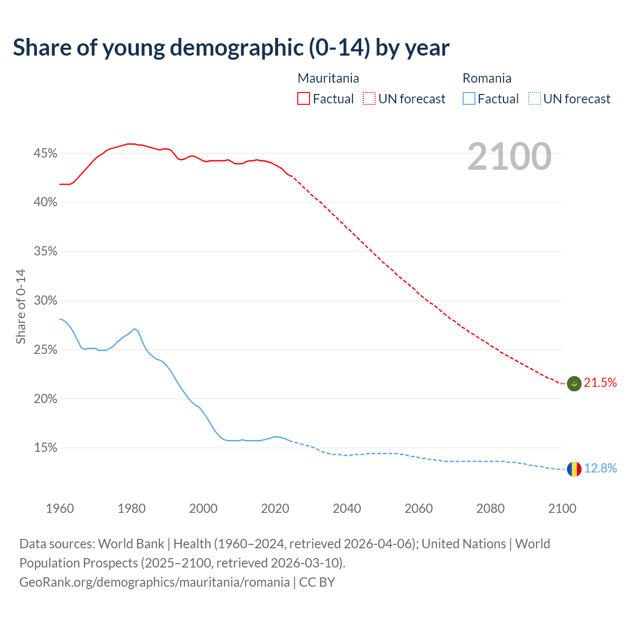 - The share of young demographic (0-15 years old) in Mauritania is 42.7% vs 15.7% in Romania.